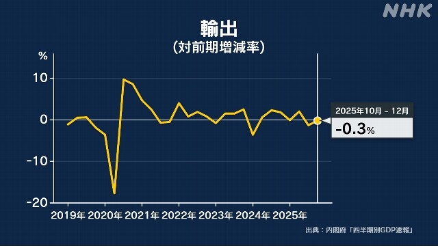 Tuy nhiên, lĩnh vực xuất khẩu của Nhật Bản trong Quý IV tiếp tục giảm 0,3% - là con số âm trong quý thứ hai liên tiếp, dù mức thâm hụt đã thu hẹp so với quý trước nhờ các yếu tố như việc Mỹ giảm thuế nhập khẩu đối với ô tô và các sản phẩm nông nghiệp khác của Nhật Bản từ tháng 9 năm ngoái. Theo đánh giá của các chuyên gia, quan hệ Nhật Bản - Trung Quốc xấu đi là một trong những yếu tố tác động tiêu cực đến lĩnh vực xuất khẩu của Nhật Bản.
