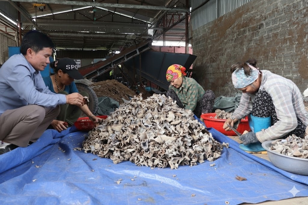 Sơ chế nấm tại Hợp tác xã nấm - đông trùng hạ thảo Bio Fine (xã Quốc Oai, thành phố Hà Nội). Ảnh: Nguyễn Mai