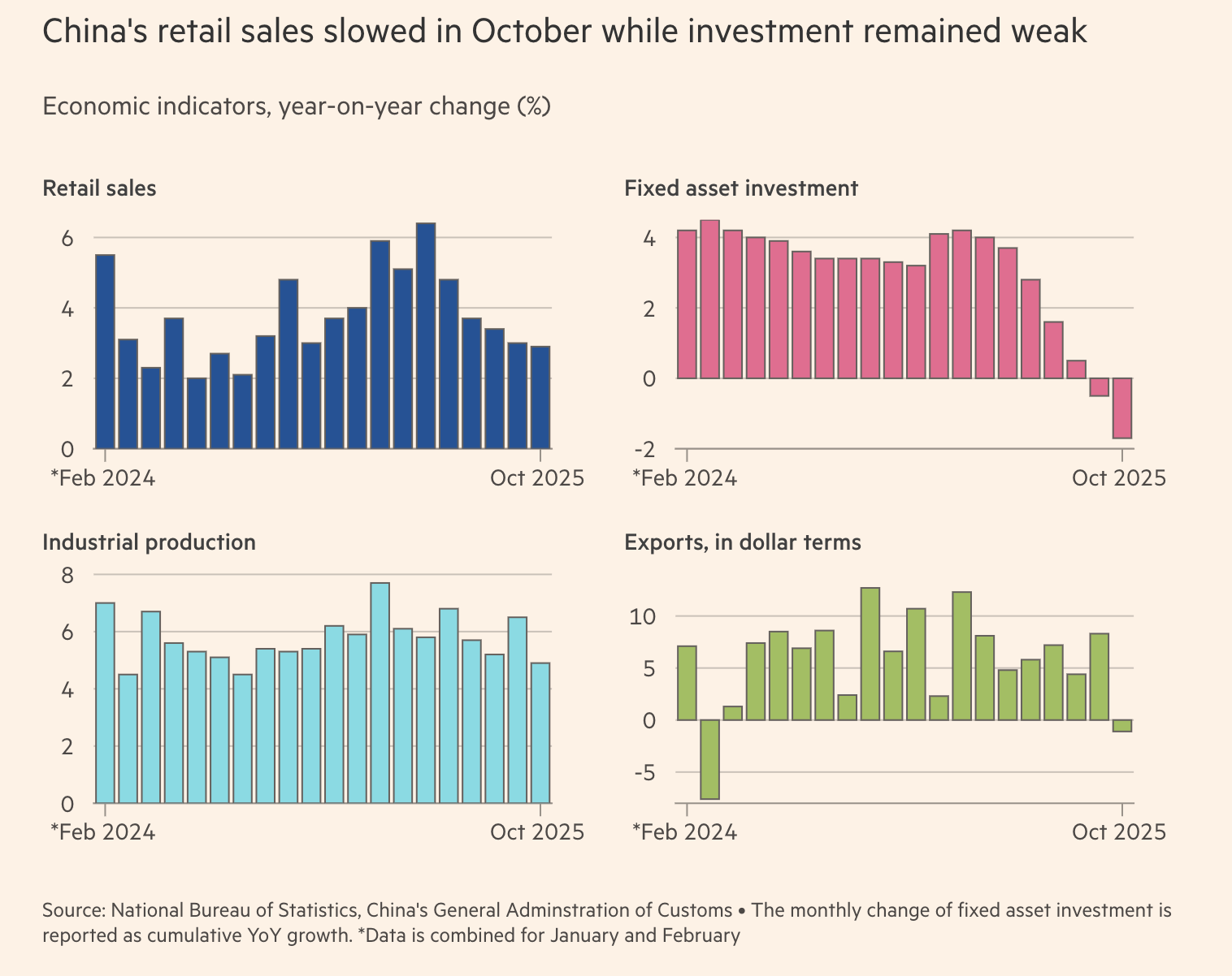 Doanh số bán lẻ của Trung Quốc chậm lại trong tháng 10, trong khi đầu tư vẫn yếu. Biểu đồ: Financial Times.