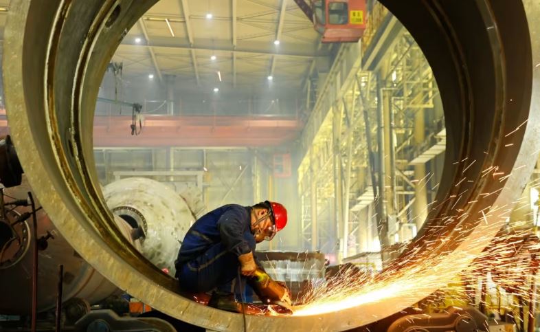 Công nhân làm việc trong một nhà máy sản xuất thiết bị hóa dầu ở thành phố Thanh Đảo, tỉnh Sơn Đông, Trung Quốc. Ảnh: CFOTO/Reuters