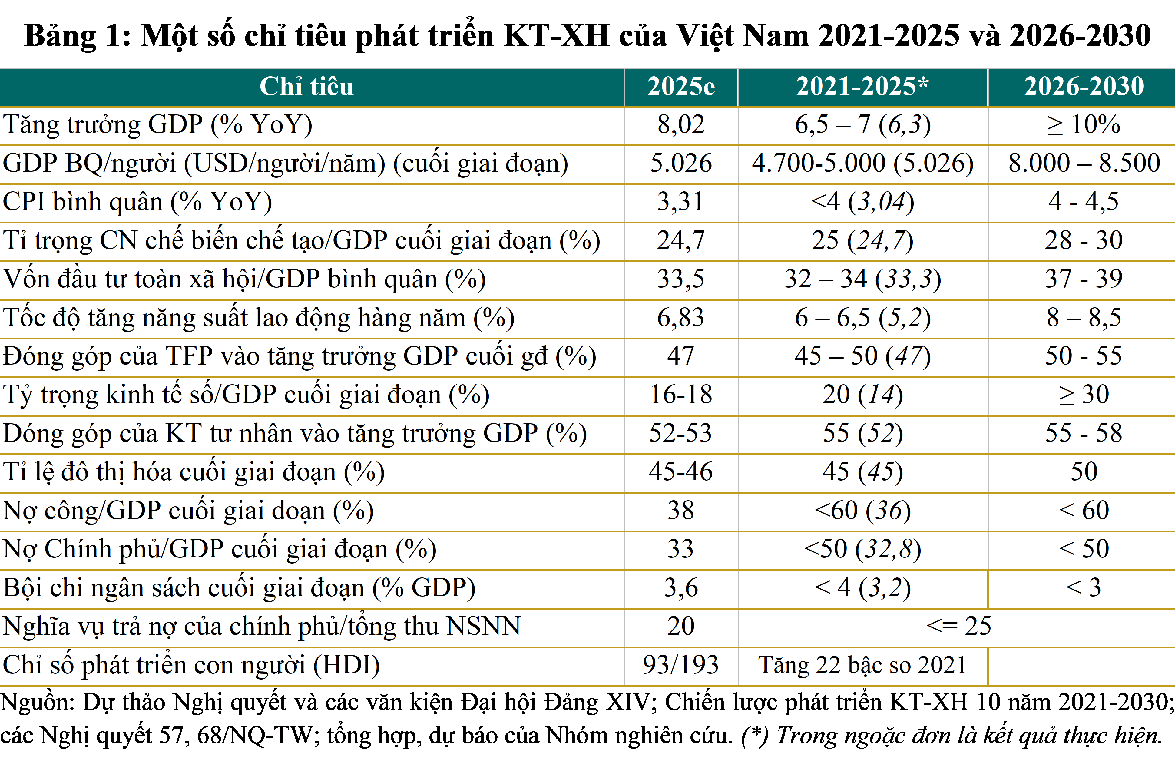 Văn kiện Đại hội XIV của Đảng nêu rõ: phấn đấu đạt tốc độ tăng trưởng GDP bình quân giai đoạn 2026-2030 từ 10%/năm trở lên; GDP bình quân đầu người đến năm 2030 đạt khoảng 8.500 USD/năm, gắn với ổn định kinh tế vĩ mô, nâng cao chất lượng và hiệu quả của nền kinh tế, cùng với nhiều định hướng, nhiệm vụ quan trọng, cụ thể về xác lập mô hình tăng trưởng mới dựa trên khoa học công nghệ, đổi mới sáng tạo, chuyển đổi số và nâng cao hiệu quả cơ cấu lại nền kinh tế, thực hiện ba đột phá chiến lược...