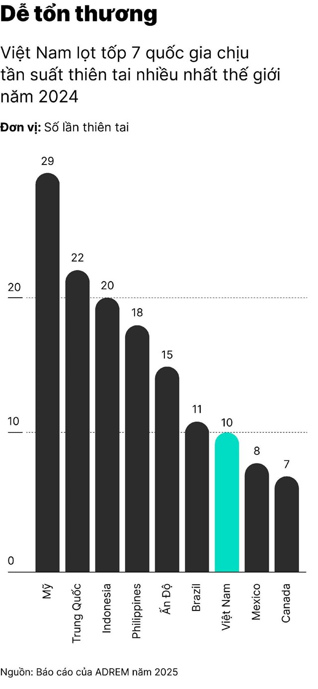 Dữ liệu từ báo cáo Đánh giá tác động của thiên tai toàn cầu năm 2024 của ADREM ghi nhận Việt Nam là một trong những quốc gia chịu tần suất rủi ro thiên nhiên cao với 10 sự kiện lớn trong năm. Tổng giá trị thiệt hại kinh tế ước tính khoảng 3,2 tỷ USD. Tuy nhiên, khi đặt lên bàn cân so sánh về quy mô nền kinh tế, tỷ lệ thiệt hại trên tổng sản phẩm quốc nội (GDP) của Việt Nam được kiểm soát ở mức 0,7%. Đây là một chỉ số tích cực khi so sánh với các quốc gia có diện tích lớn và nền kinh tế phát triển như Mỹ hay Canada, nơi tỷ lệ thiệt hại/GDP có thể lên tới hai chữ số trước các thảm họa thiên nhiên.