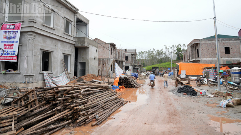 Không khí xây dựng khẩn trương tại khu dân cư tái định cư Hồ Sơn-Hòa Thắng thuộc xã Hữu Lũng, tỉnh Lạng Sơn.