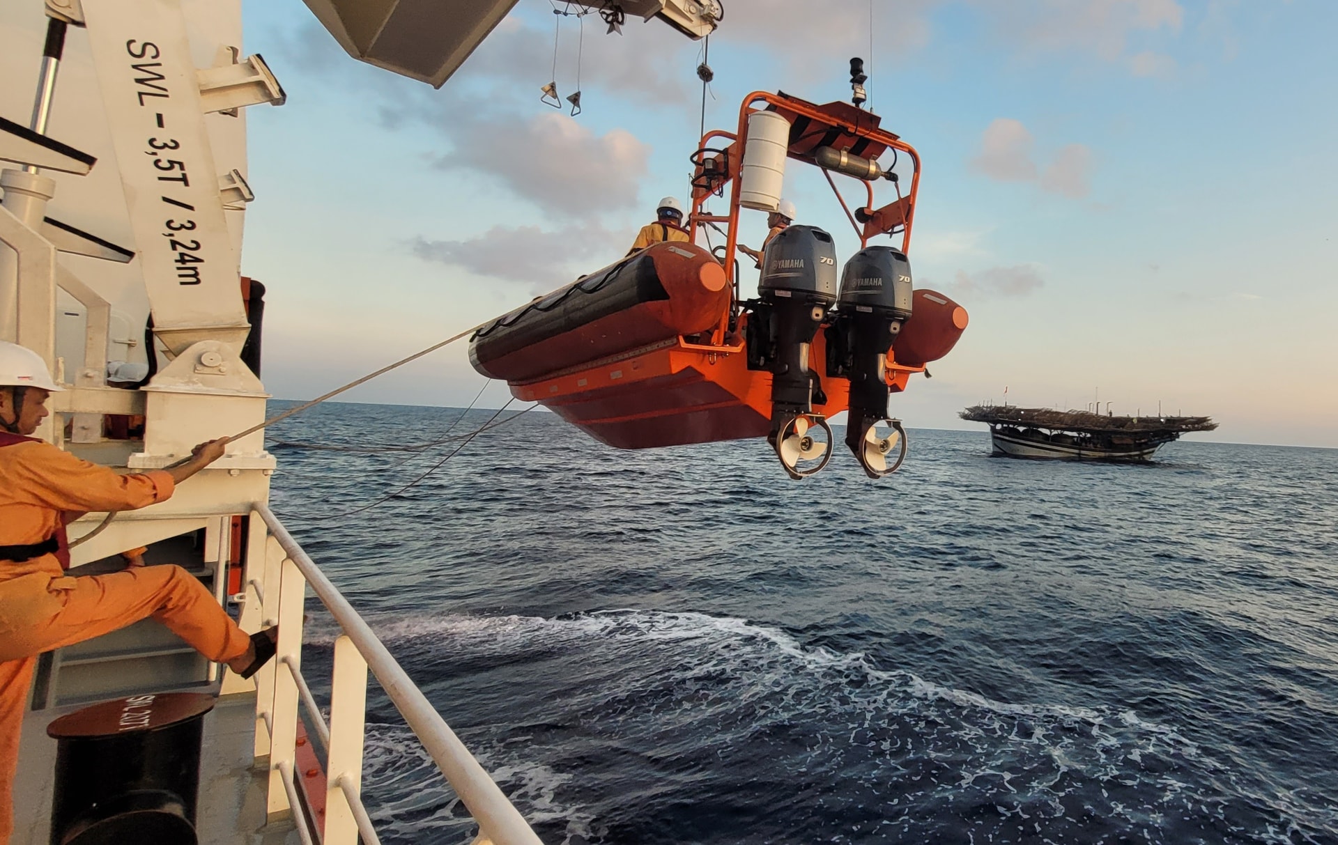 Lúc 5 giờ 24 phút ngày 17/4, tàu SAR 631 tiếp cận tàu cá có ngư dân gặp nạn và triển khai các biện pháp cấp cứu tại chỗ. Ảnh: Danang MRCC cung cấp.