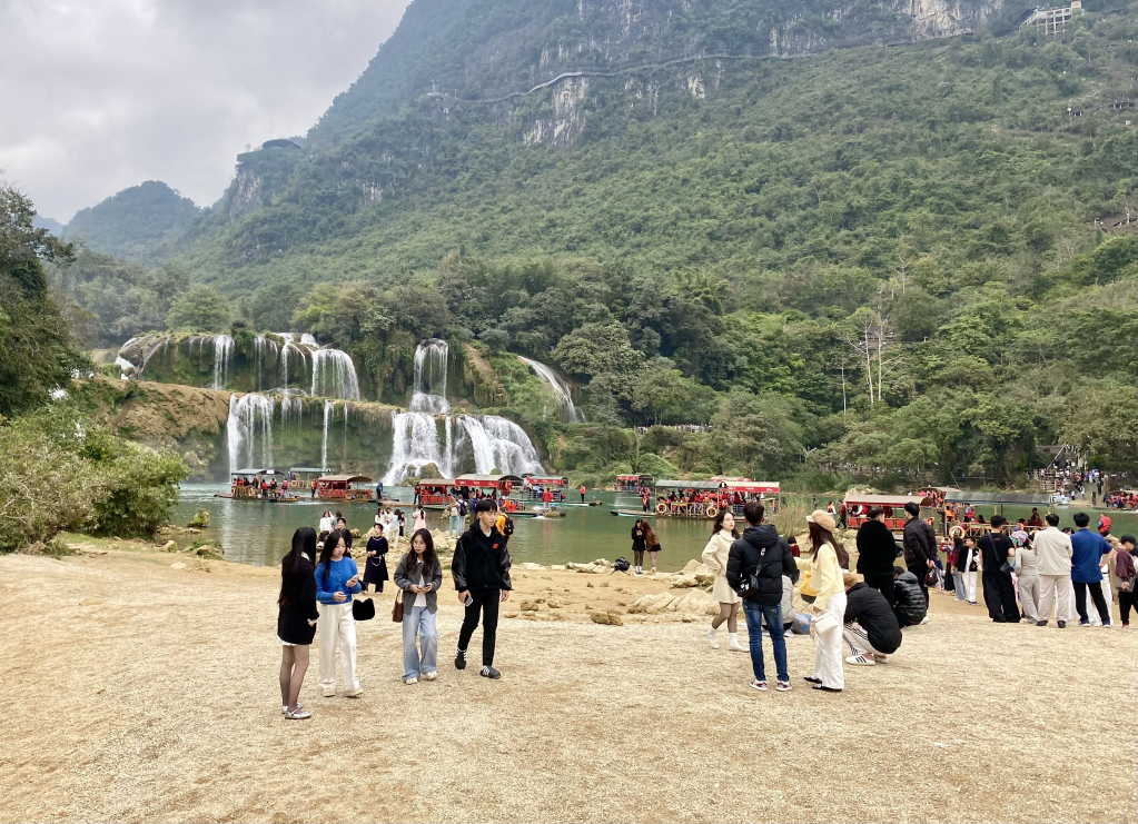 Hoạt động tham quan của du khách tại Thác Bản Giốc diễn ra trật tự sau khi tình trạng bè mảng tự chế được chấn chỉnh.