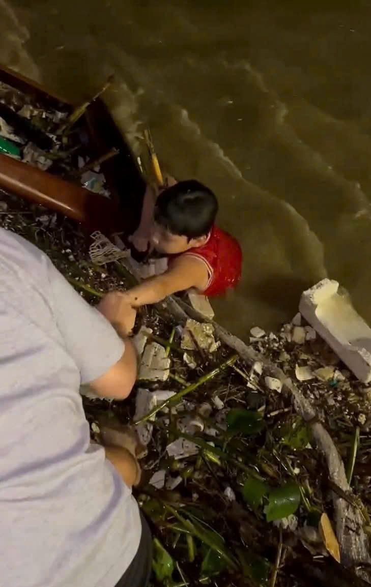 Hai thanh niên nhanh chóng trèo qua lan can, bám vào thành sắt, nhoài người ra nắm lấy cánh tay cậu bé. Chỉ trong chưa đầy một phút, nhờ sự bình tĩnh và phối hợp ăn ý, họ đã kéo được đứa trẻ lên bờ an toàn trong tiếng thở phào của những người chứng kiến.