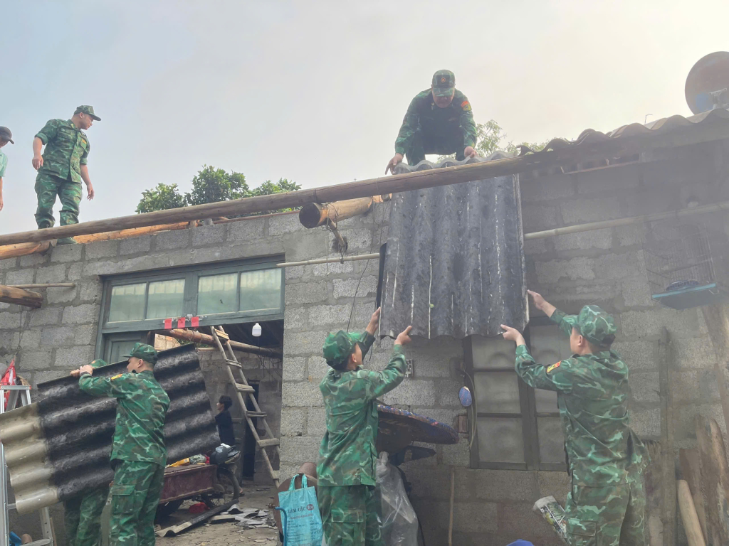 Cán bộ, chiến sĩ đồn Biên phòng Cửa khẩu quốc tế Tà Lùng giúp gia đình Nguyễn Văn Hoàng khắc phục hậu quả do lốc xoáy gây ra.