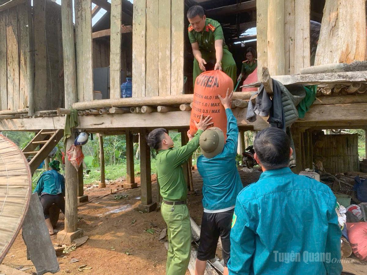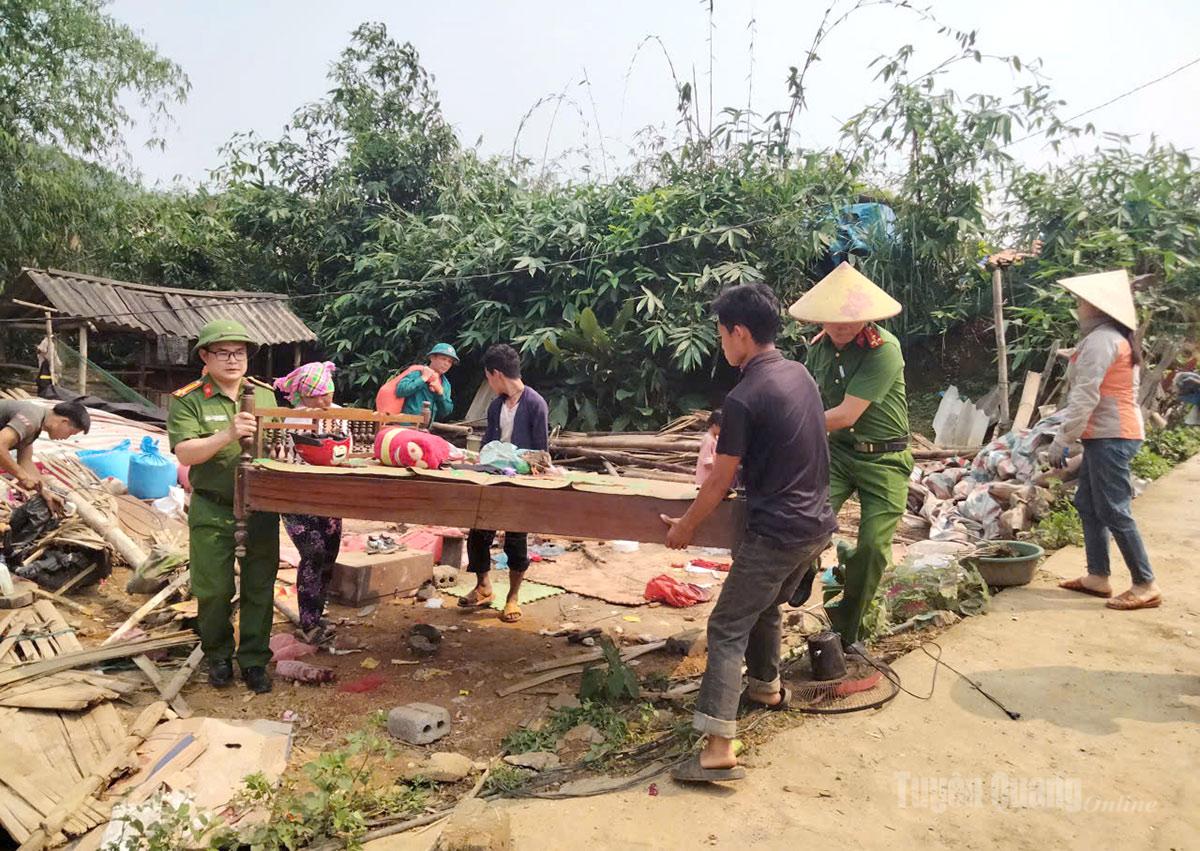Lực lượng công an, dân quân và người dân khẩn trương hỗ trợ gia đình bị thiệt hại dp thiên tai.