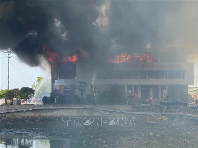 Ngọn lửa bắt đầu từ tầng 3 của Công ty TNHH Chế biến gỗ và thương mại Hào Quang (phường Thành Sen, Hà Tĩnh) và cháy lan sang các khu vực khác.