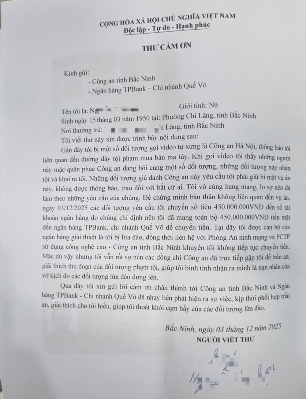 Sau khi được tuyên truyền và nhận ra thủ đoạn của nhóm lừa đảo, bà L. và gia đình bày tỏ sự cảm kích, gửi thư cảm ơn tới Công an tỉnh Bắc Ninh và TPBank - Chi nhánh Quế Võ. Bà L. cho biết chính nhờ sự phát hiện, ngăn chặn và xử lý nhanh chóng, trách nhiệm của các cán bộ công an và ngân hàng mà bà đã vượt qua được tâm lý hoang mang và bảo vệ được tài sản của mình.