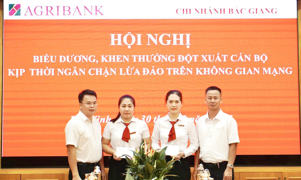 Lãnh đạo Agribank Chi nhánh Bắc Giang khen thưởng Trần Thị Hoàng Yến và Triệu Ngọc Mai Phương vì tinh thần trách nhiệm cao trong công tác, góp phần bảo vệ quyền lợi khách hàng.