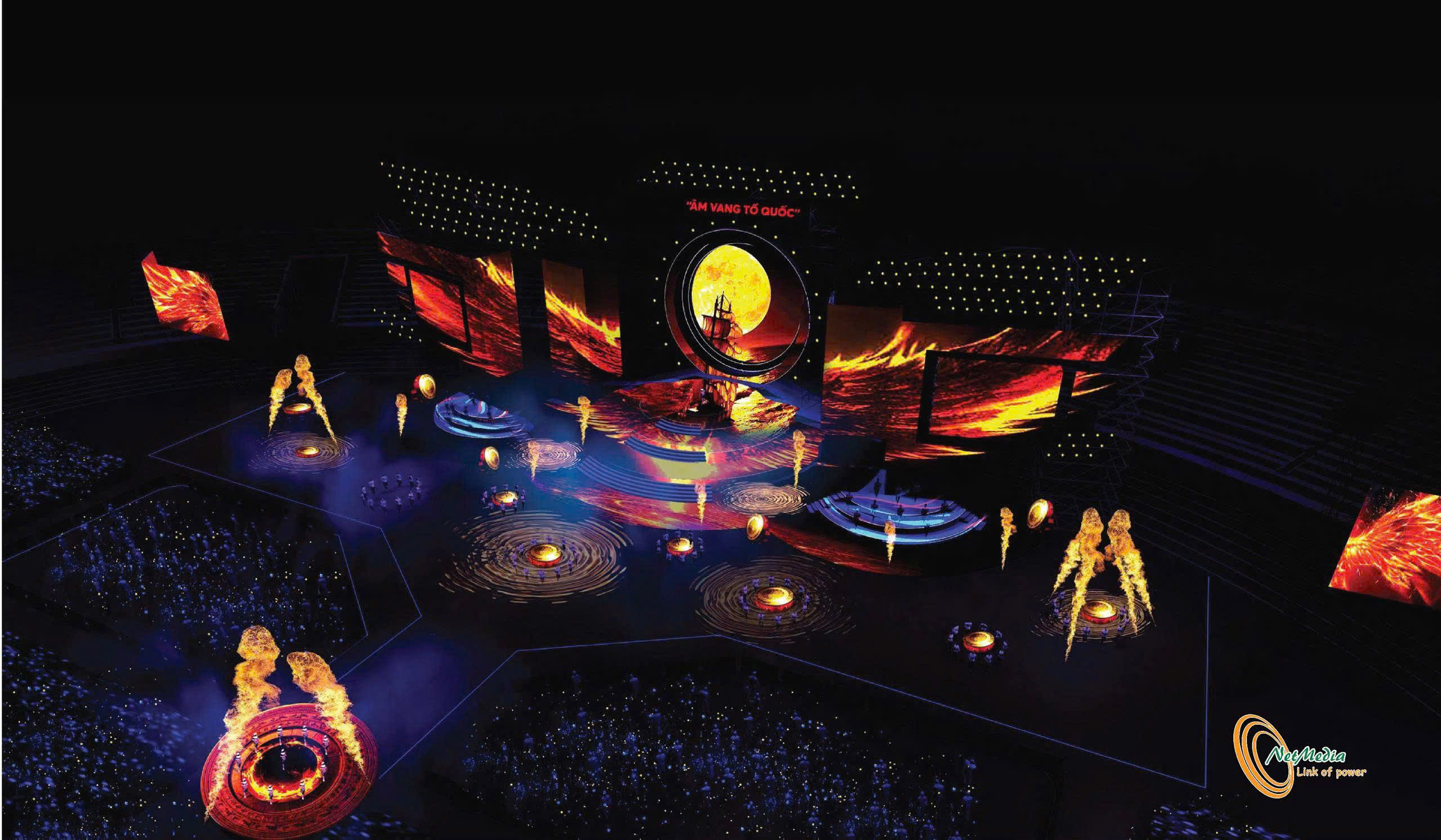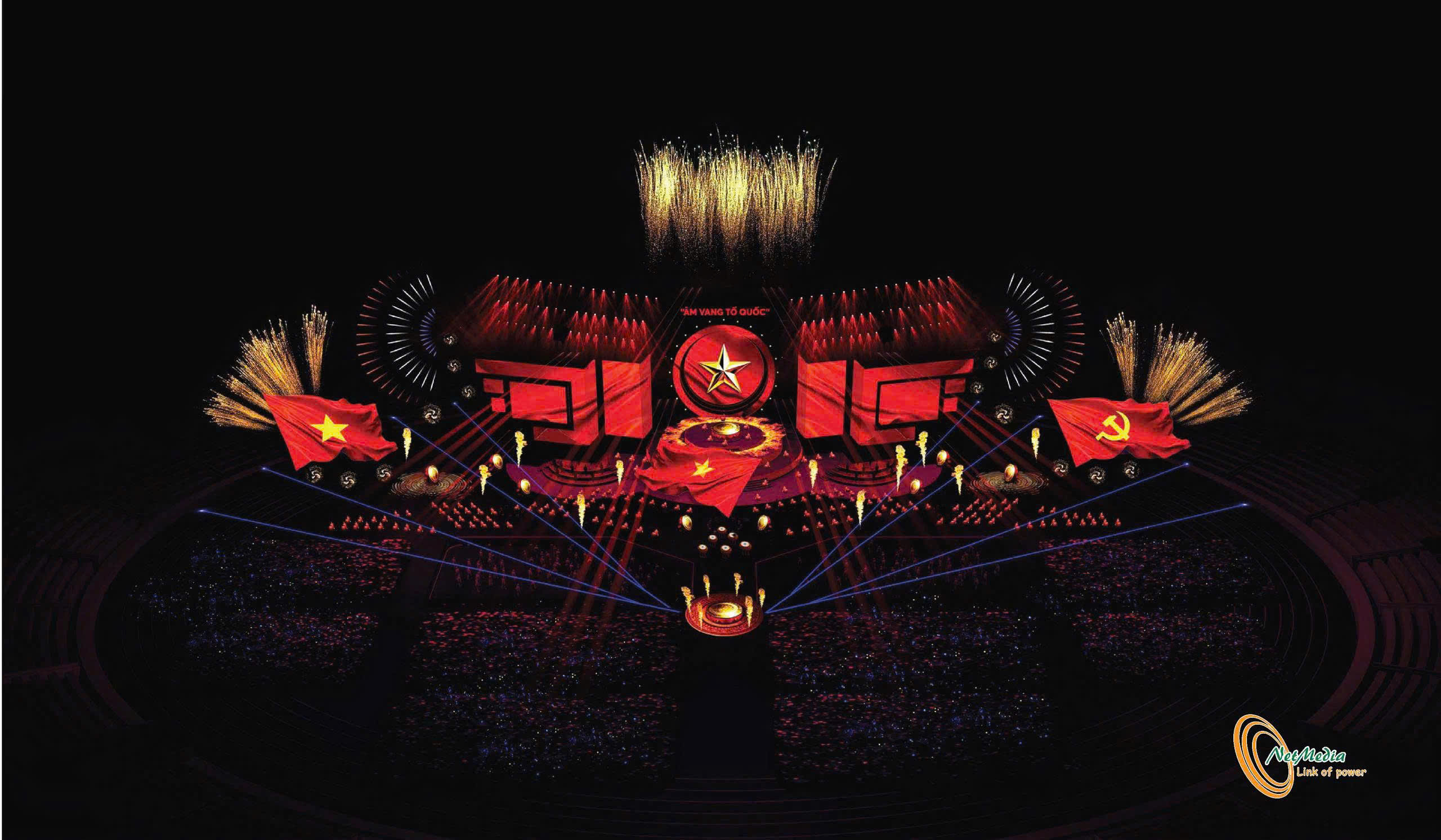 Phối cảnh sân khấu chương trình nghệ thuật chính luận đặc biệt "Âm vang Tổ quốc". Ảnh: BTC