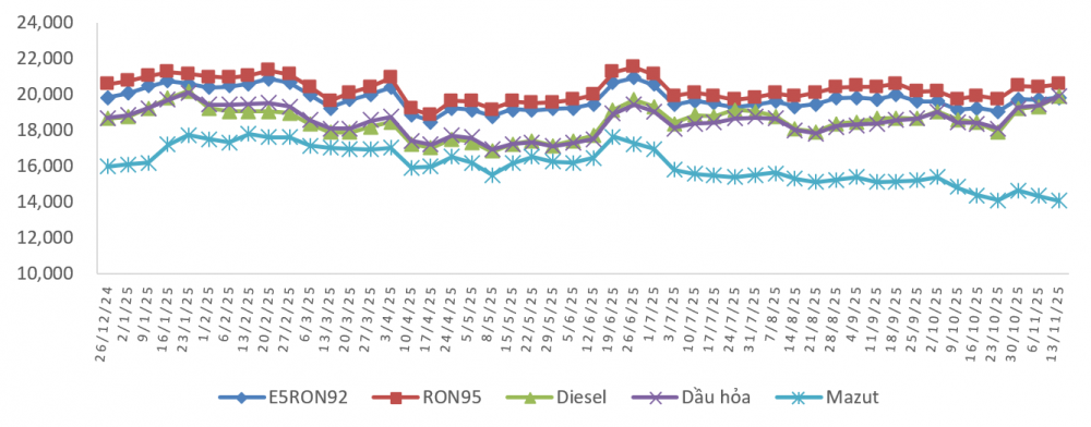 Biến động giá bán lẻ xăng dầu trong nước (26/12/2024 - 13/11/2025) - Nguồn: Liên Bộ Công Thương - Tài chính