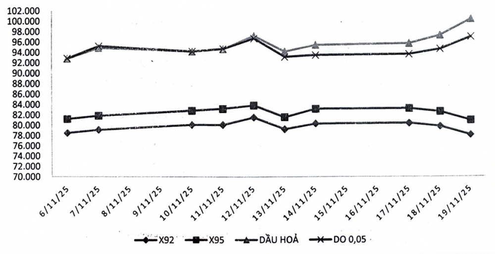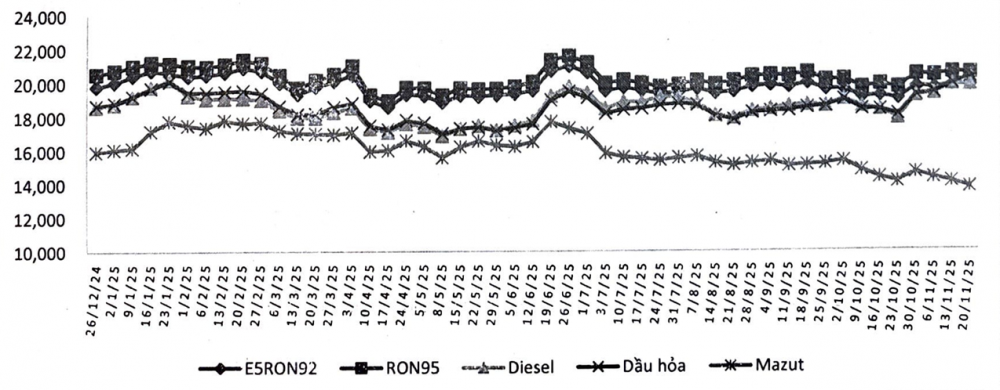 Biến động giá bán lẻ xăng dầu trong nước (26/12/2024 - 20/11/2025) - Nguồn: Liên Bộ Công Thương - Tài chính