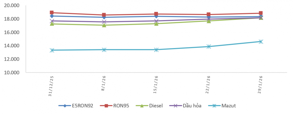 Biến động giá bán lẻ xăng dầu trong nước (31/12/2025 - 29/1/2026) (Nguồn: Liên Bộ Công Thương - Tài chính)
