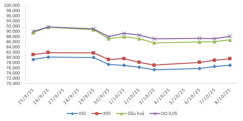 Bình quân giá thành phẩm xăng dầu thế giới giữa kỳ điều hành giá ngày 02/10/2025 và kỳ điều hành ngày 09/10/2025 là: 76,138 USD/thùng xăng RON92 dùng để pha chế xăng E5RON92 (giảm 2,578 USD/thùng, tương đương giảm 3,28%); 78,322 USD/thùng xăng RON95 (giảm 2,366 USD/thùng, tương đương giảm 2,93%); 86,298 USD/thùng dầu hỏa (giảm 3,088 USD/thùng, tương đương giảm 3,45%); 87,660 USD/thùng dầu diesel 0,05S (giảm 2,308 USD/thùng, tương đương giảm 2,57%); 392,696 USD/tấn dầu mazut 180CST 3,5S (giảm 19,100 USD/tấn, tương đương giảm 4,64%).