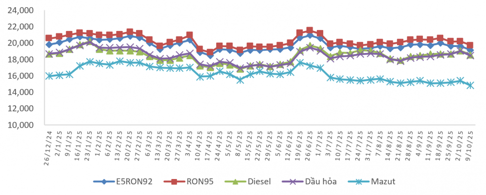 Biến động giá bán lẻ xăng dầu trong nước (26/12/2024 - 9/10/2025) - Nguồn: Liên Bộ Công Thương - Tài chính