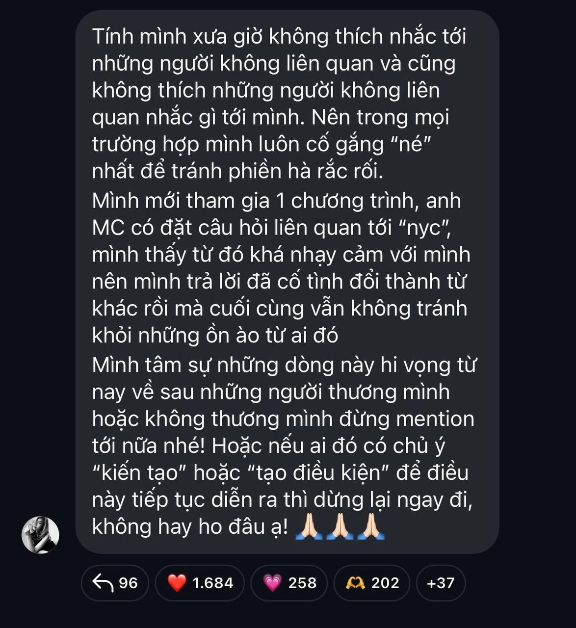 Người đẹp sinh năm 1996 cũng gửi lời nhắn nhủ trực tiếp: "Nếu ai đó có chủ ý 'kiến tạo' hoặc 'tạo điều kiện' để điều này tiếp tục diễn ra thì dừng lại ngay đi, không hay ho đâu ạ".