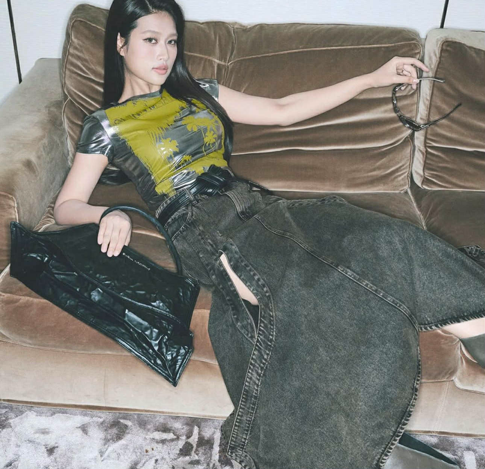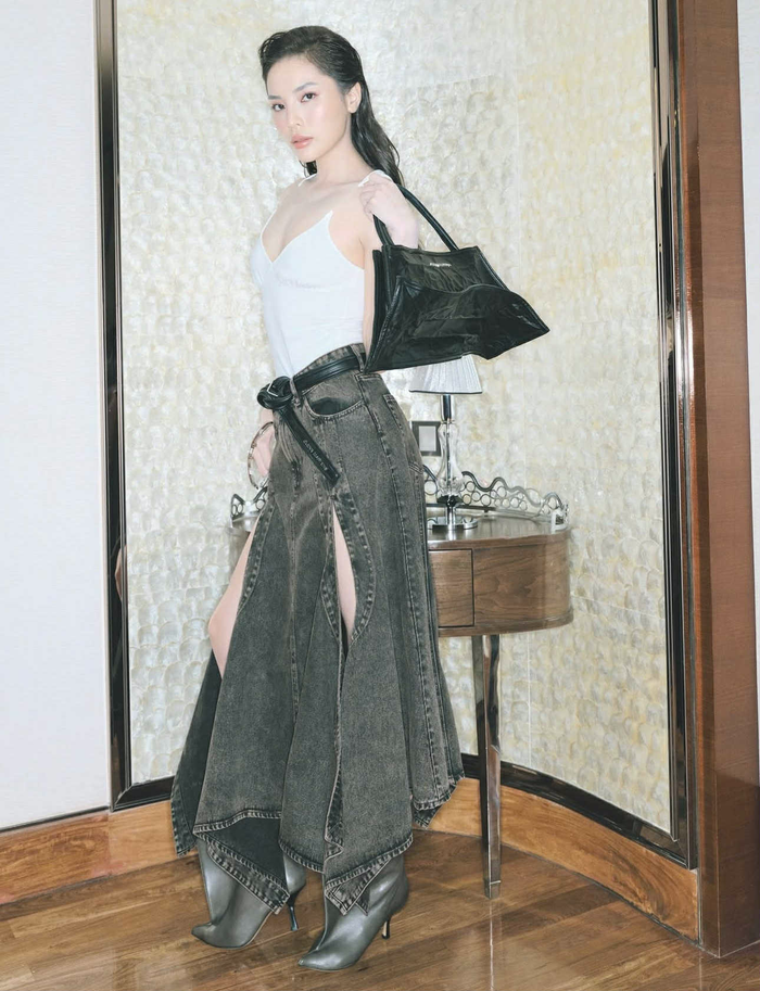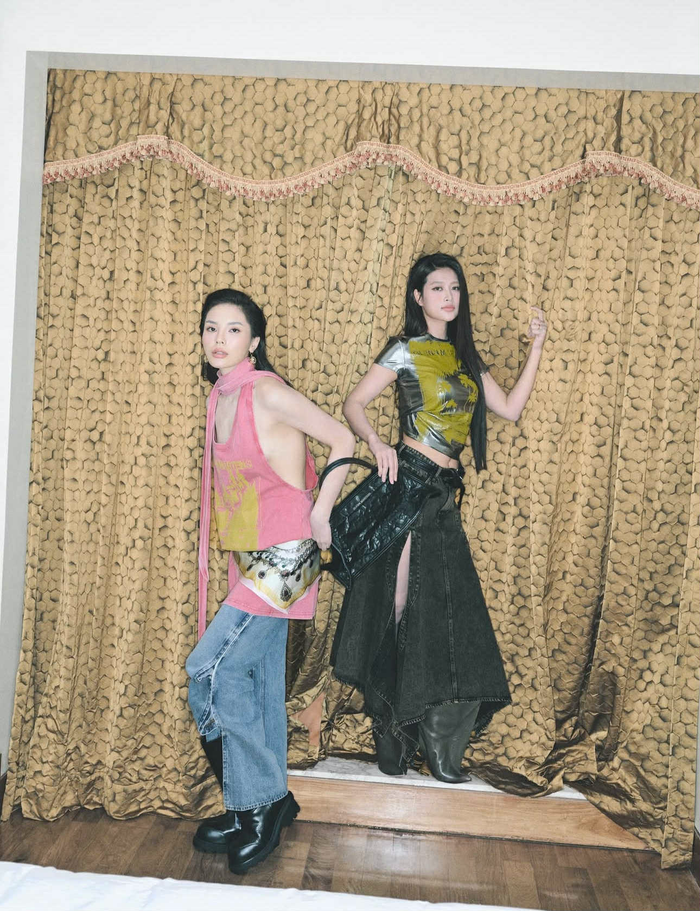 Trong ảnh, Đoàn Thiên Ân diện áo phông crop top ôm sát tông vàng phối cùng chân váy denim xẻ cao, khoe đôi chân dài gợi cảm và vòng eo săn chắc. Cô kết hợp boots cao cổ, kính đen và túi da bản to, tạo nên tổng thể thời thượng và sắc sảo. Trong khi đó, Kỳ Duyên lại chọn phong cách phóng khoáng với áo hồng xuyên thấu, quàng khăn mảnh, mix cùng quần jeans phá cách và boots da. Hai người đẹp đứng cạnh nhau, tạo dáng tự tin và đầy tình tứ như đôi bạn thân có gu ăn mặc đồng điệu.