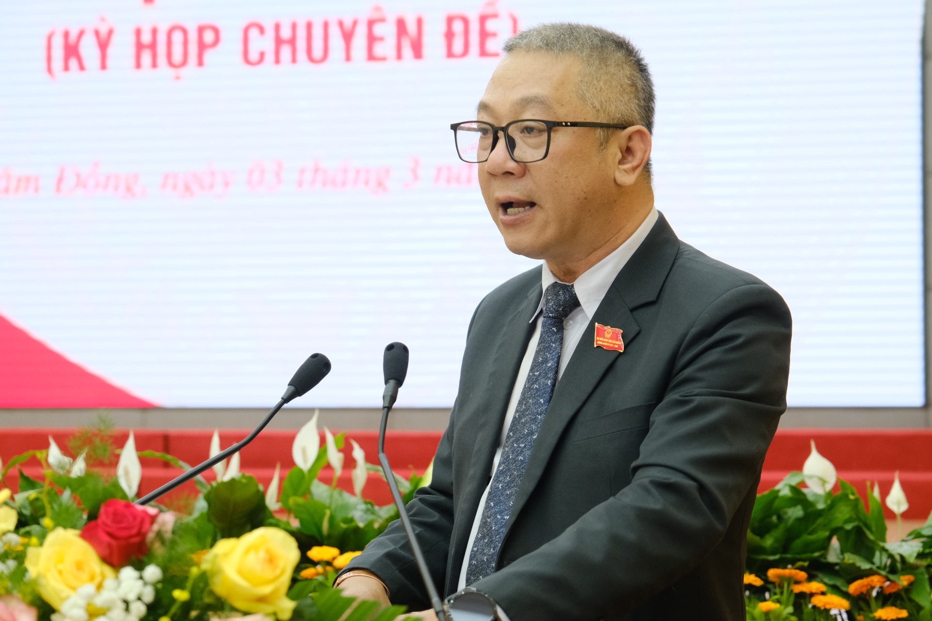 Giám đốc Sở Tài chính Lâm Đồng Tôn Thiện San thừa ủy quyền Chủ tịch UBND tỉnh, trình bày các tờ trình và dự thảo nghị quyết tại kỳ họp