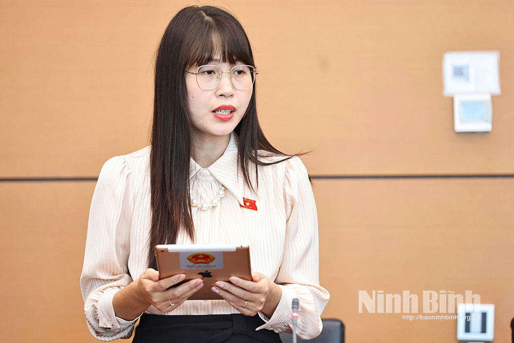 Đại biểu Khương Thị Mai, Giám đốc điều hành Công ty TNHH nhôm Nam Sung (Đoàn ĐBQH tỉnh Ninh Bình) phát biểu thảo luận tại Tổ.