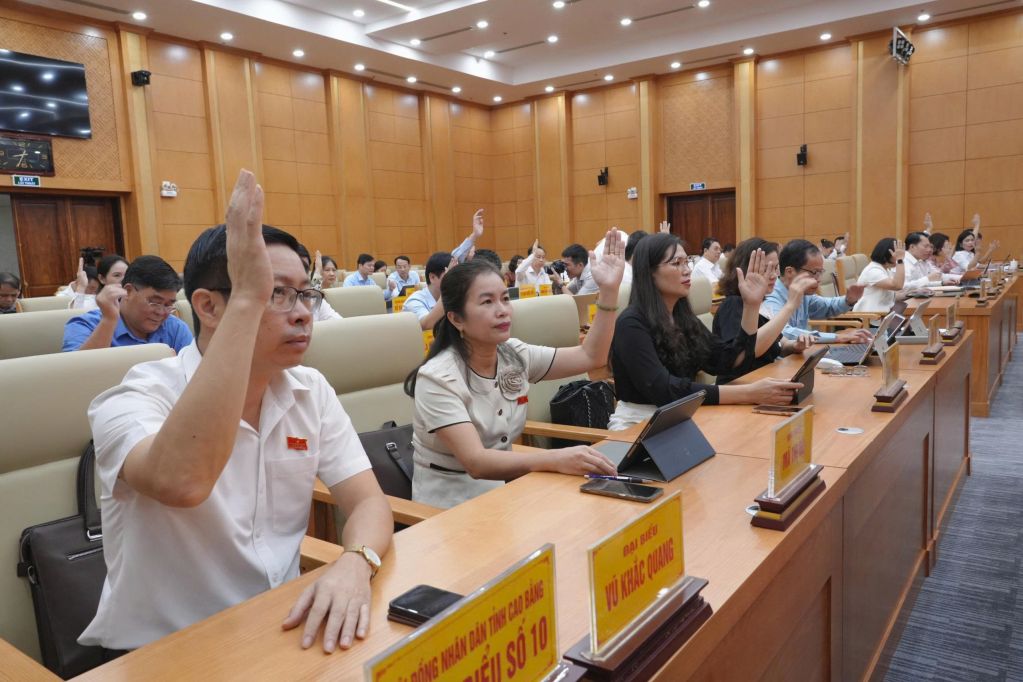 Sau một buổi làm việc khẩn trương, nghiêm túc, với tinh thần đoàn kết, dân chủ, trách nhiệm cao, các đại biểu HĐND tỉnh thống nhất cho ý kiến đối với 4 tờ trình, thảo luận, nhất trí thông qua 7 nghị quyết quan trọng: Nghị quyết quy định chính sách đối với người làm việc ngoài chỉ tiêu biên chế tại các Hội do Đảng, Nhà nước giao nhiệm vụ ở cấp tỉnh theo Nghị quyết số 07/2025/NQ-CP ngày 17/9/2025 của Chính phủ; Nghị quyết về chủ trương chuyển mục đích sử dụng rừng sang mục đích khác (bổ sung đợt 5); Nghị quyết phê duyệt danh sách thôn (xóm) tập trung đông đồng bào dân tộc có khó khăn đặc thù thuộc diện đầu tư xây dựng, nâng cấp, cải tạo sửa chữa cơ sở hạ tầng theo Chương trình Mục tiêu quốc gia phát triển kinh tế - xã hội vùng đồng bào dân tộc thiểu số và miền núi giai đoạn 2021 - 2030, giai đoạn I: Từ năm 2021 đến năm 2025 trên địa bàn tỉnh; Tờ trình xin ý kiến HĐND tỉnh về việc sửa đổi, bổ sung một số điều của Quyết định số 56/2024/QĐ-UBND ngày 30/10/2024 của UBND tỉnh quy định tỷ lệ phần trăm (%) để tính đơn giá thuê đất, đơn giá thuê đất để xây dựng công trình ngầm, đơn giá thuế đất với đất có mặt nước trên địa bàn tỉnh; Nghị quyết Kỳ họp thứ 36 (chuyên đề) HĐND tỉnh khóa XVII, nhiệm kỳ 2021 - 2026.