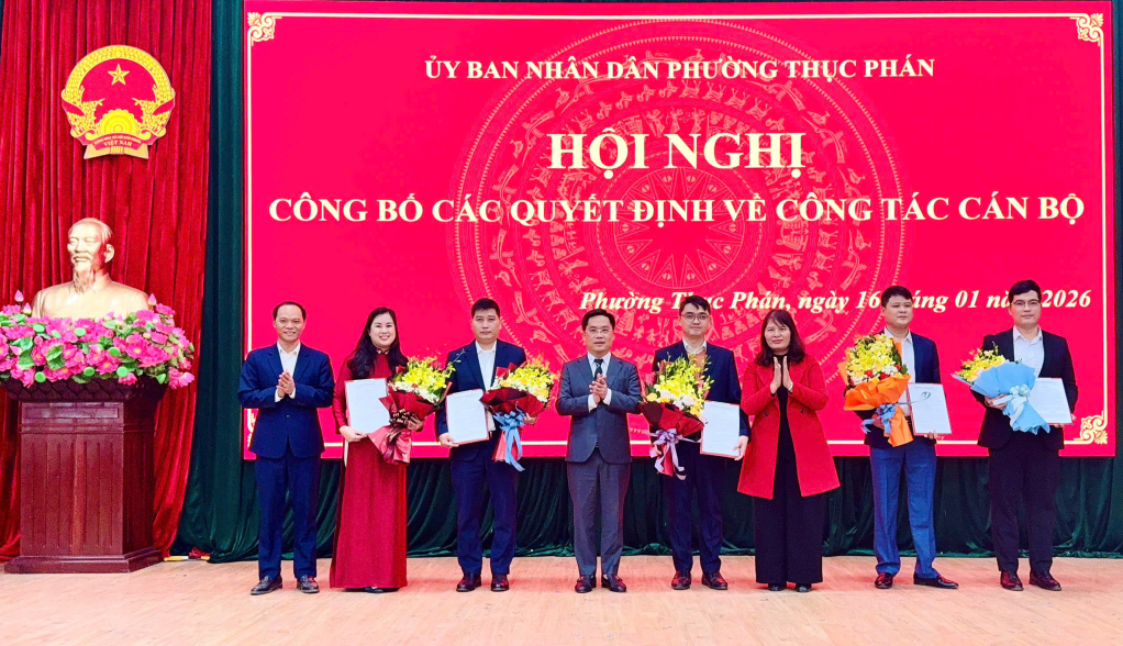 Hội nghị công bố các quyết định bổ nhiệm cán bộ lãnh đạo, quản lý đối với các phòng, ban, đơn vị trực thuộc. Cụ thể, bổ nhiệm đồng chí Phạm Xuân Hưởng, chuyên viên Văn phòng HĐND và UBND phường Thục Phán, giữ chức vụ Phó Chánh Văn phòng HĐND và UBND phường Thục Phán; bổ nhiệm đồng chí Hoàng Khánh Bằng, Phó Giám đốc Trung tâm Phục vụ hành chính công phường Thục Phán, giữ chức vụ Giám đốc Trung tâm Phục vụ hành chính công Phường Thục Phán; bổ nhiệm đồng chí Đàm Như Quỳnh, Chuyên viên Trung tâm Phục vụ hành chính công phường Thục Phán, giữ chức vụ Phó Giám đốc Trung tâm Phục vụ hành chính công phường Thục Phán; bổ nhiệm đồng chí Lưu Quang Hùng, Chuyên viên Phòng Kinh tế, Hạ tầng và Đô thị phường Thục Phán, giữ chức vụ Phó Trưởng phòng Kinh tế, Hạ tầng và Đô thị phường Thục Phán; quyết định điều động đồng chí Vũ Anh Tuấn, viên chức Ban Quản lý Dự án phường Thục Phán, đến công tác tại Trung tâm Dịch vụ tổng hợp phường Thục Phán và bổ nhiệm giữ chức vụ Phó Giám đốc Trung tâm Dịch vụ tổng hợp phường Thục Phán.