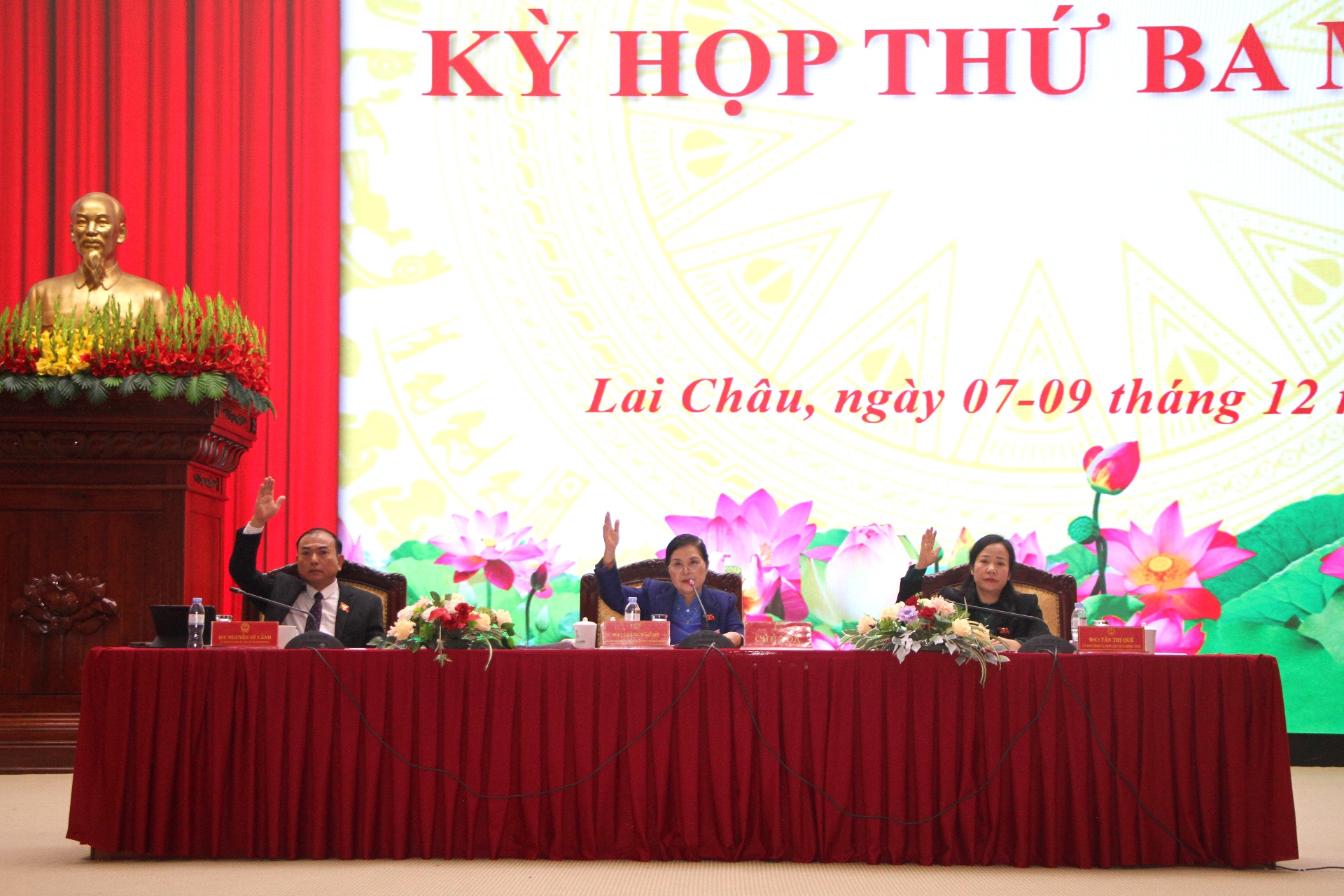 Đồng chí Giàng Páo Mỷ - Ủy viên Ban Chấp hành Trung ương Đảng, Chủ tịch HĐND tỉnh, Trưởng Đoàn Đại biểu Quốc hội tỉnh và các đồng chí Phó Chủ tịch HĐND tỉnh điều hành kỳ họp.