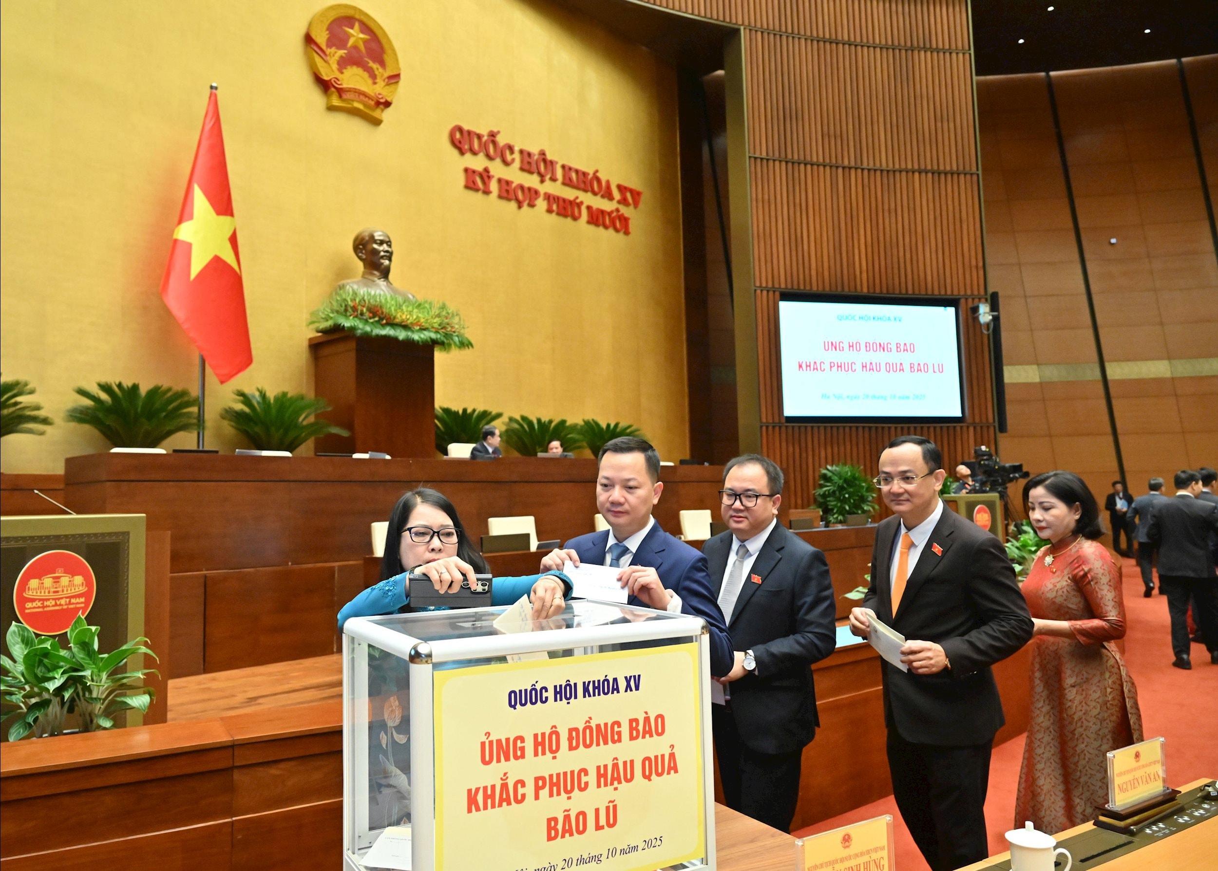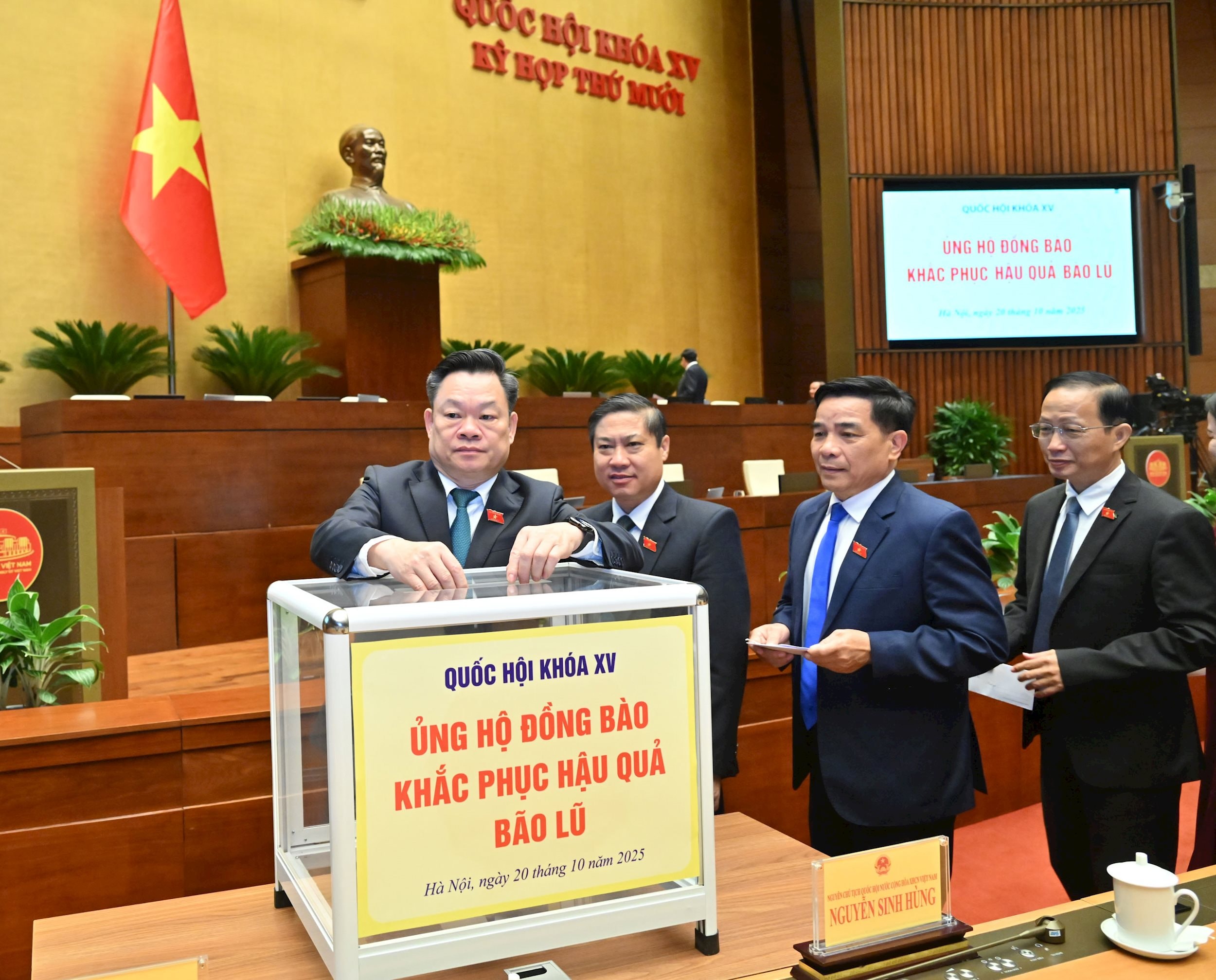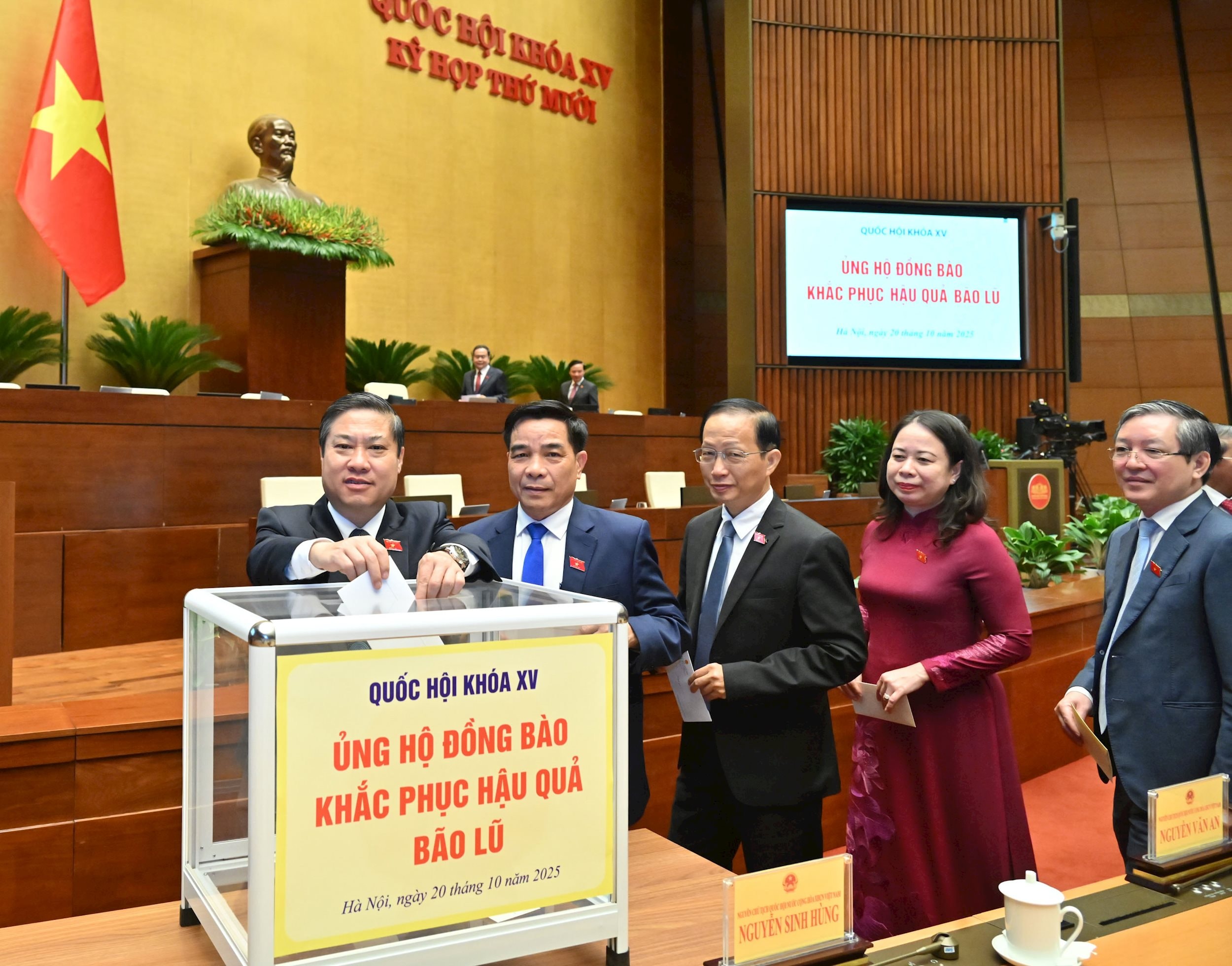Các đại biểu Quốc hội ủng hộ đồng bào khắc phục hậu quả bão lũ. Ảnh: Lâm Hiển