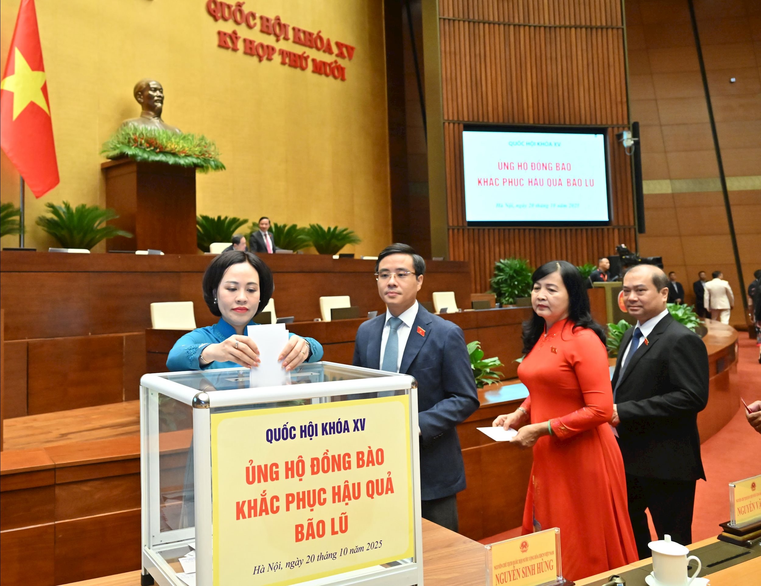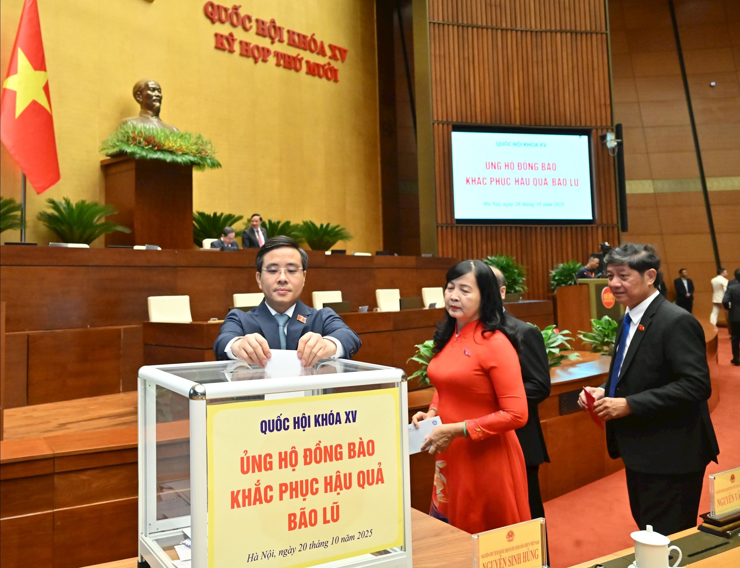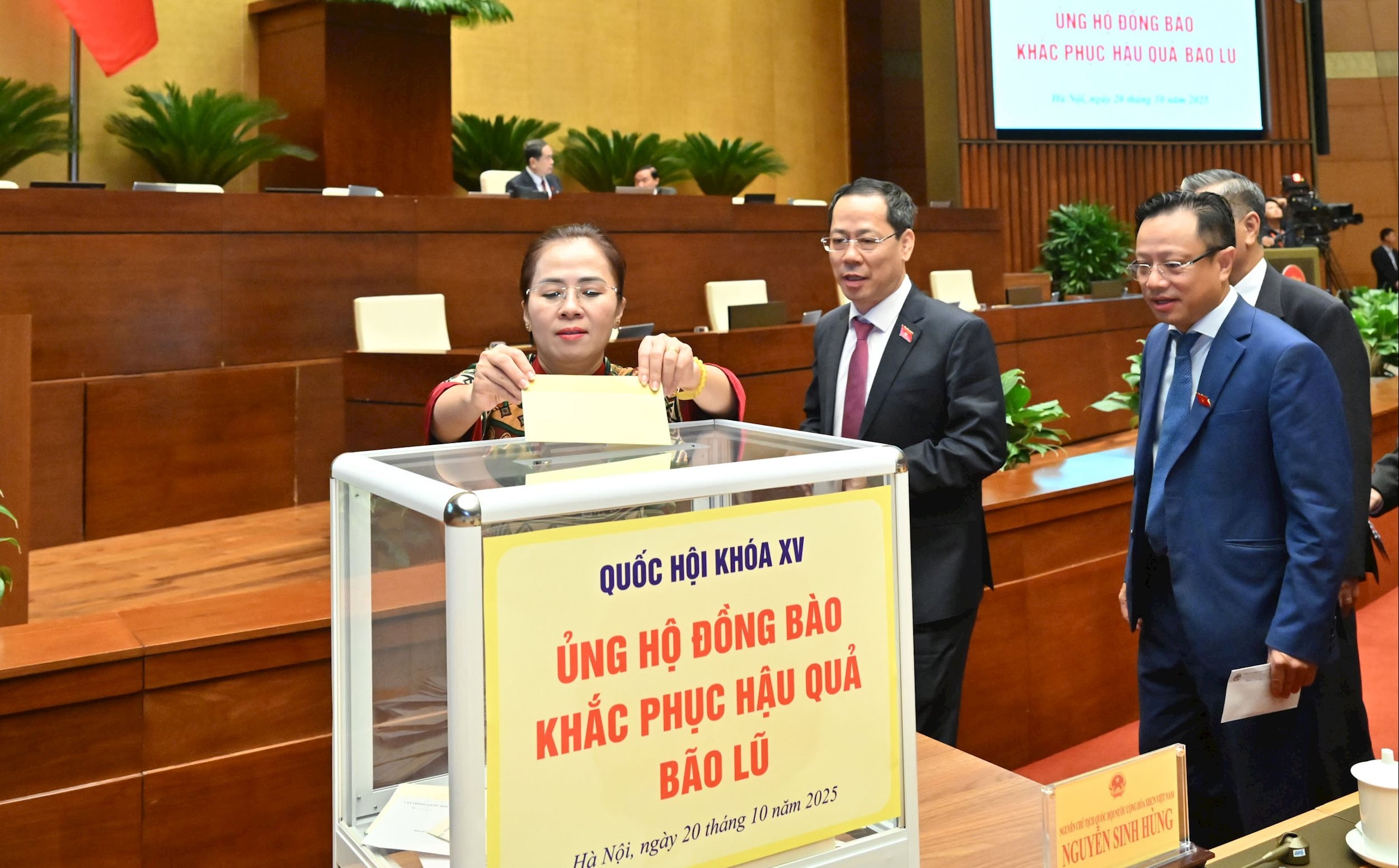 Các đại biểu Quốc hội ủng hộ đồng bào khắc phục hậu quả bão lũ. Ảnh: Lâm Hiển