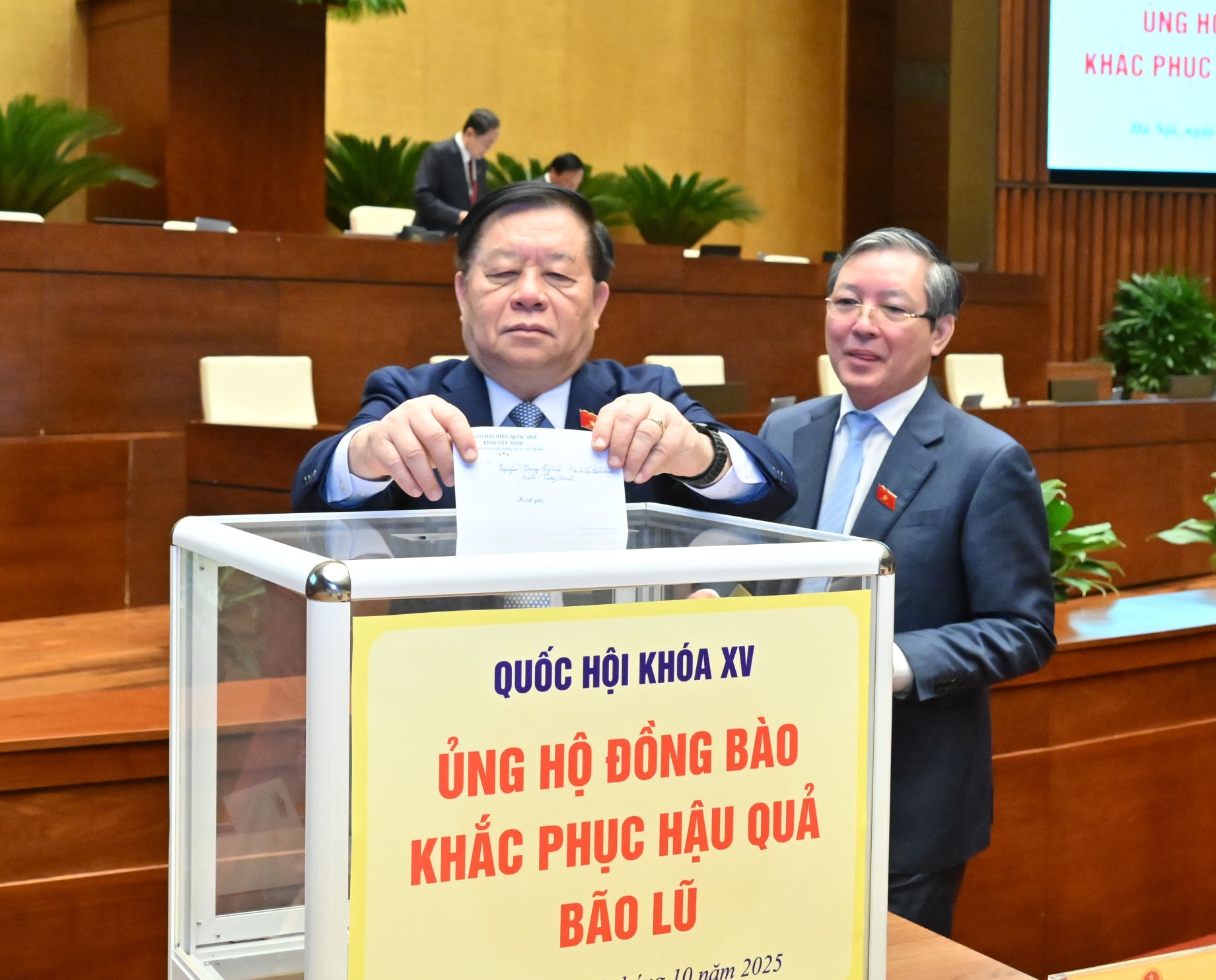 Nhân dịp này, Tổng Bí thư Tô Lâm, Chủ tịch nước Lương Cường, Thủ tướng Chính phủ Phạm Minh Chính cùng các đại biểu Quốc hội đã quyên góp ủng hộ đồng bào khắc phục hậu quả bão lũ.