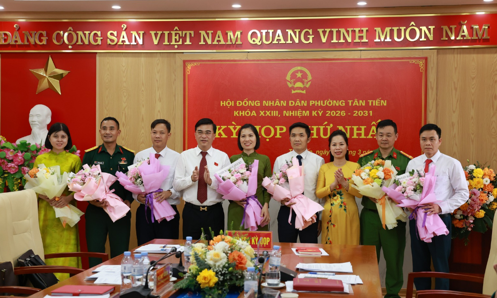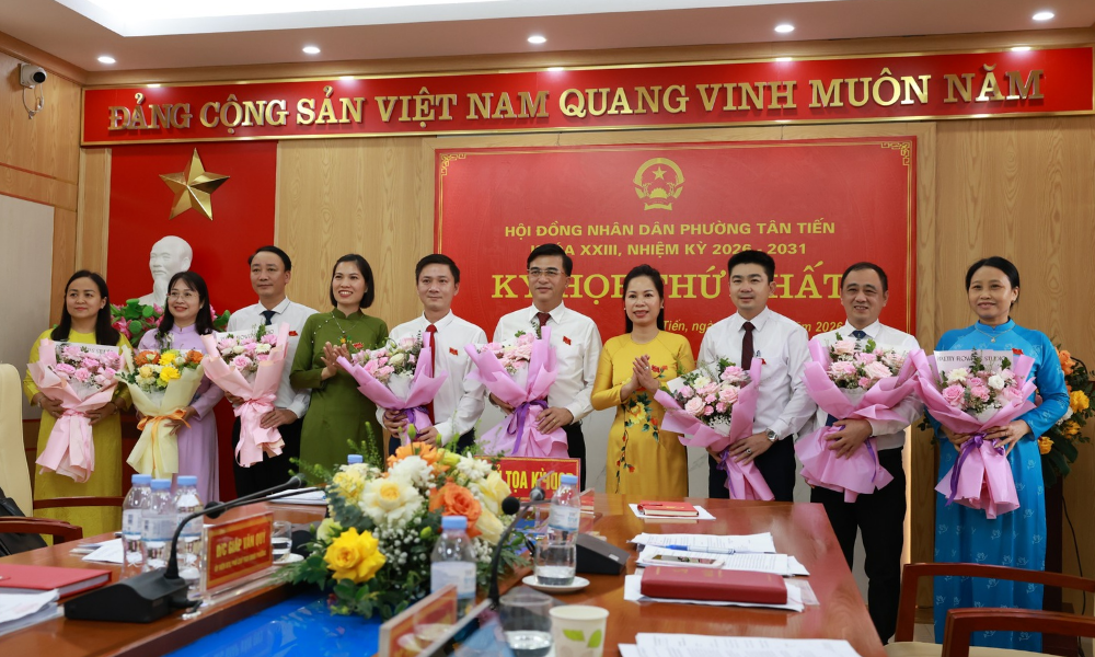 Các đồng chí được bầu giữ chức Chủ tịch, Phó Chủ tịch và Trưởng các Ban HĐND phường Tân Tiến nhiệm kỳ 2026 - 2031 ra mắt.