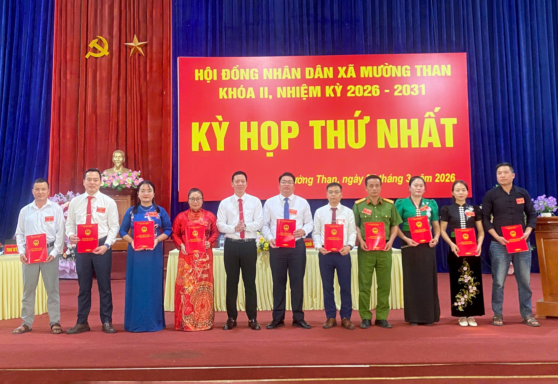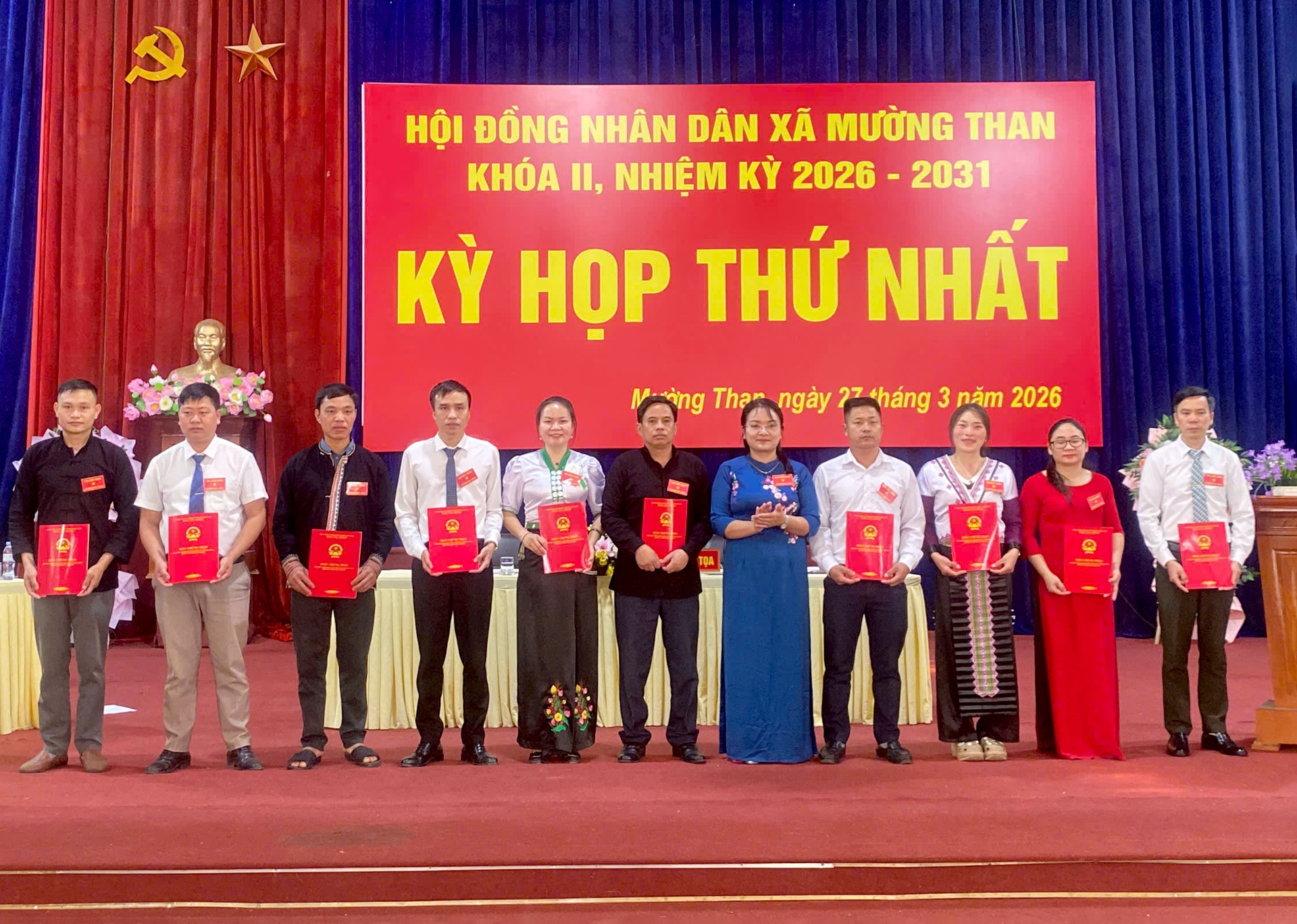 Đại diện Ủy ban Bầu cử xã Mường Than trao Giấy chứng nhận cho các đại biểu trúng cử HĐND xã khóa II, nhiệm kỳ 2026-2031.