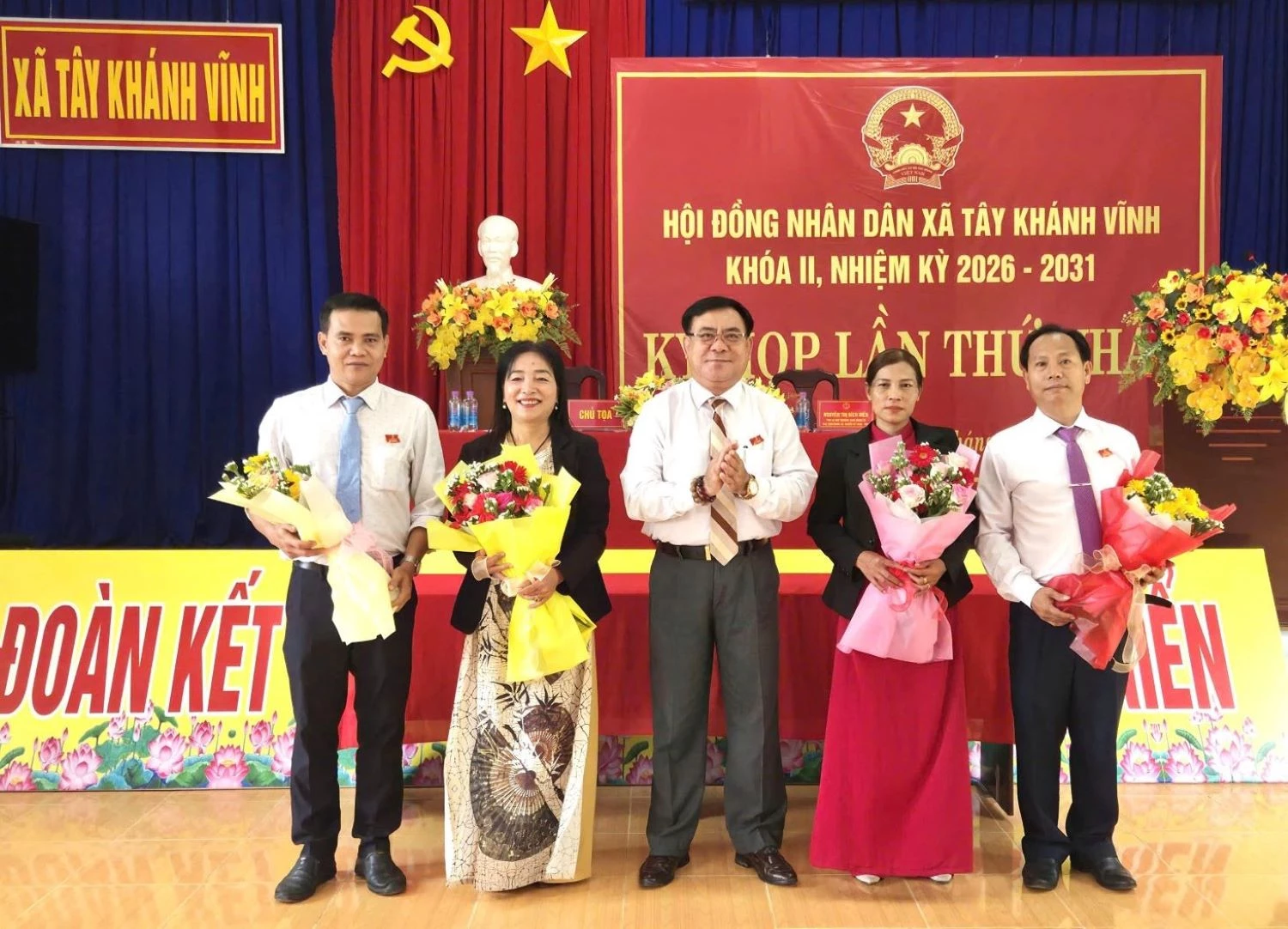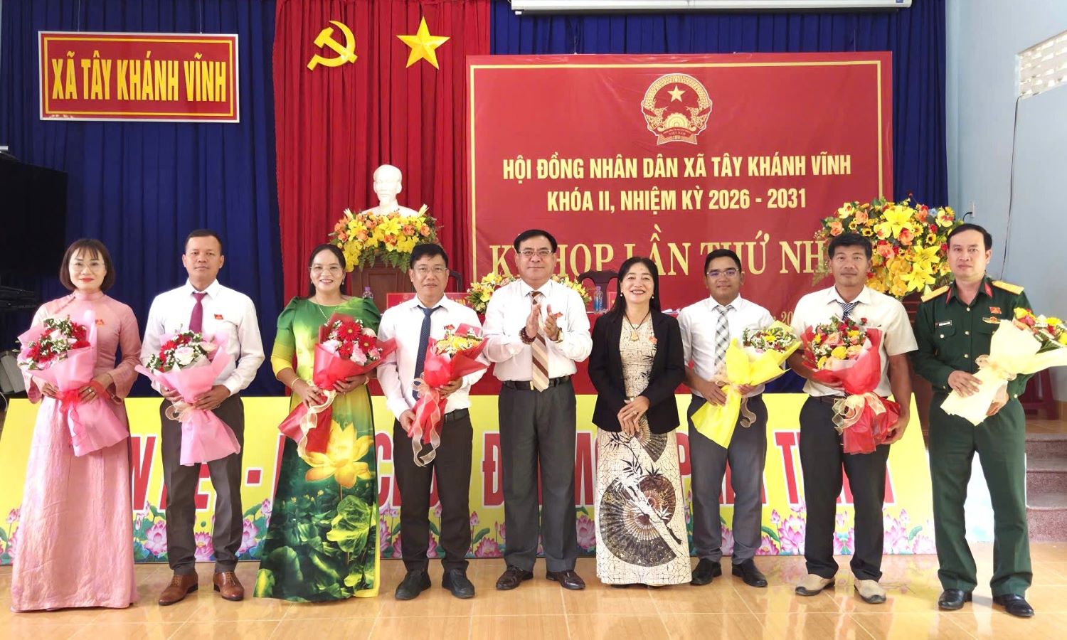 Chủ tịch, Phó Chủ tịch, các ủy viên UBND xã Tây Khánh Vĩnh nhiệm kỳ 2026 - 2031 ra mắt tại kỳ họp.