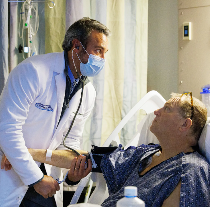 Ông Tim Andrews (giữa), bệnh nhân được ghép thận lợn biến đổi gen, trong một lần kiểm tra sức khỏe tại Bệnh viện Đa khoa Massachusetts.