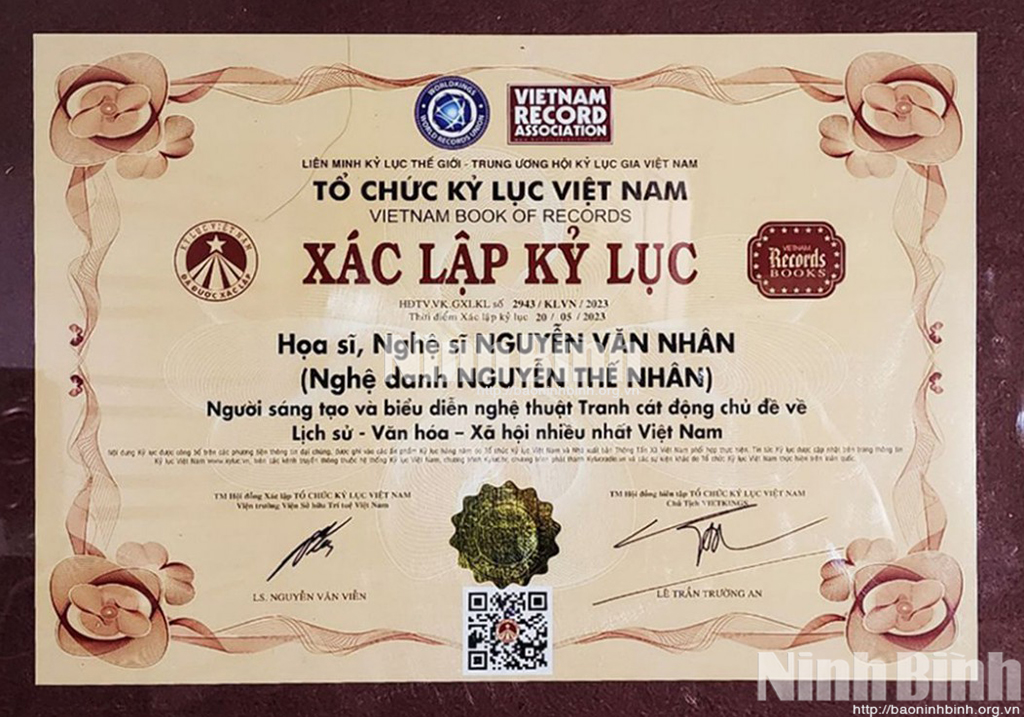 Họa sĩ Nguyễn Thế Nhân được Viện Kỷ lục Việt Nam xác lập Kỷ lục "Người sáng tạo và biểu diễn nghệ thuật Tranh cát động về chủ đề lịch sử - văn hóa - xã hội nhiều nhất Việt Nam".