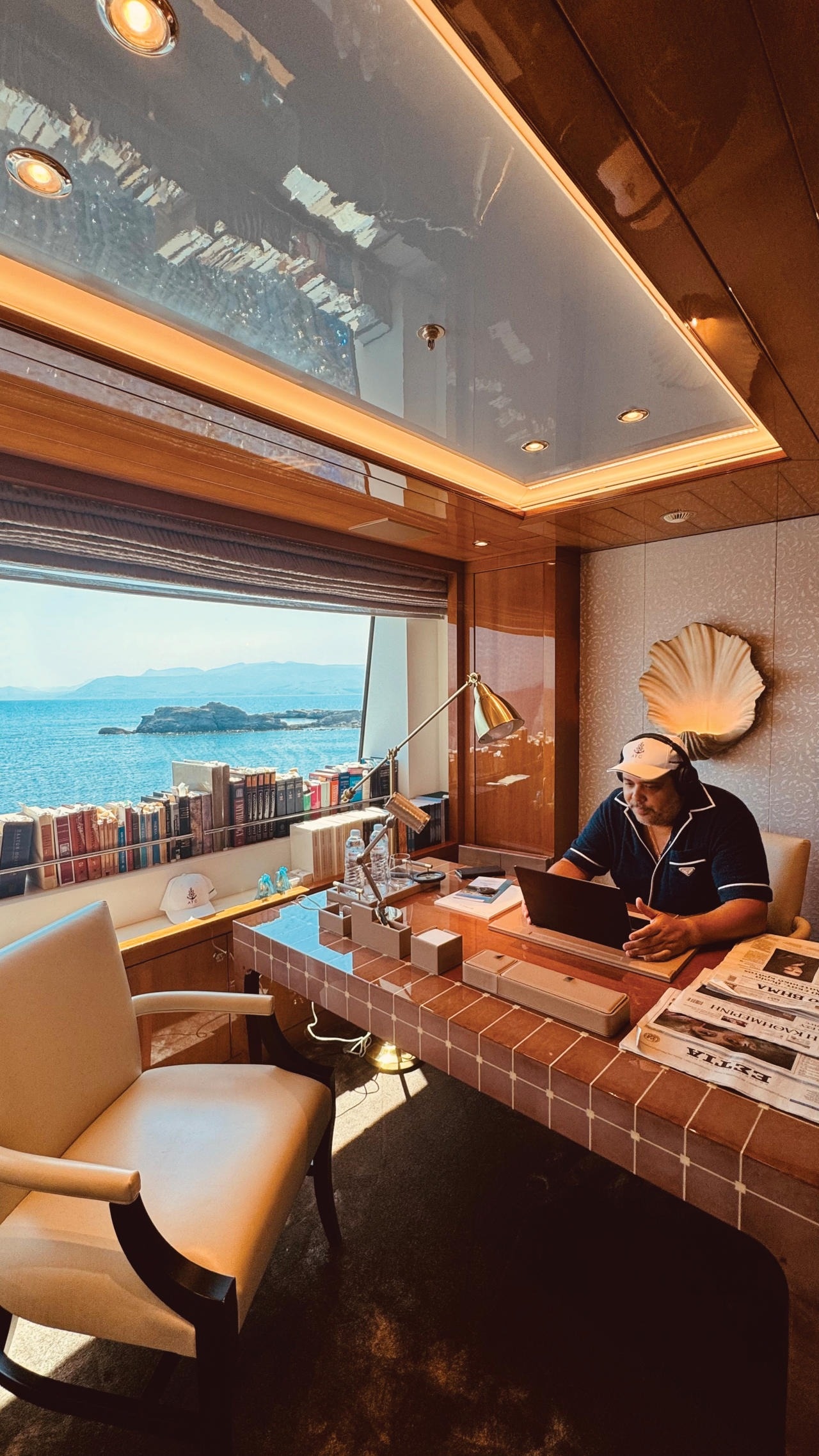 Sau đại dịch, khi làm việc từ xa trở thành bình thường mới, các doanh nhân siêu giàu nhanh chóng mở rộng khái niệm này ra đại dương. Dimitris Angelakos, người thừa kế gia tộc vận tải biển Hy Lạp và hiện điều hành đội du thuyền cho thuê riêng, cho biết ông thường bắt đầu buổi sáng bằng vài giờ email trong cabin có cửa sổ hướng thẳng ra biển, rồi kết thúc bằng cú nhảy xuống bể Jacuzzi hoặc đại dương.