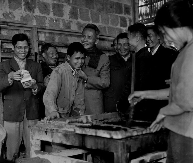 Thủ tướng Phạm Văn Đồng thăm xưởng sản xuất vật liệu xây dựng của sinh viên Đại học Bách khoa Hà Nội, năm 1969. Ảnh: TTXVN