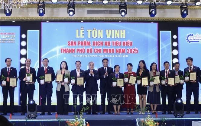Đại diện các doanh nghiệp nhận chứng nhận “Sản phẩm, dịch vụ tiêu biểu TP.HCM” năm 2025. Ảnh: Xuân Anh/TTXVN