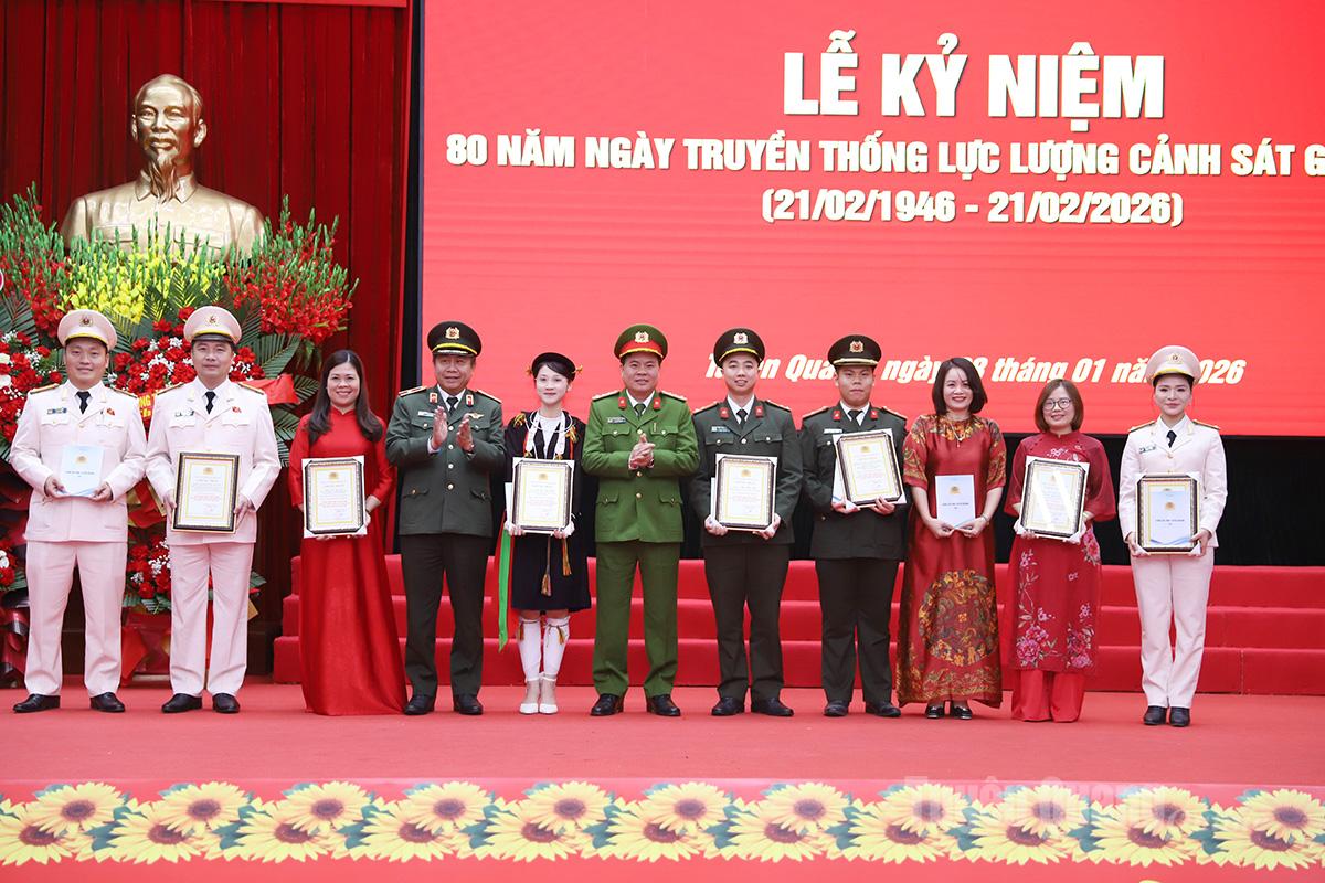 Giám đốc và Phó Giám đốc Công an tỉnh trao giải cho các tập thể, cá nhân đạt giải Cuộc thi viết “Tìm hiểu 80 năm truyền thống lực lượng Cảnh sát giao thông”