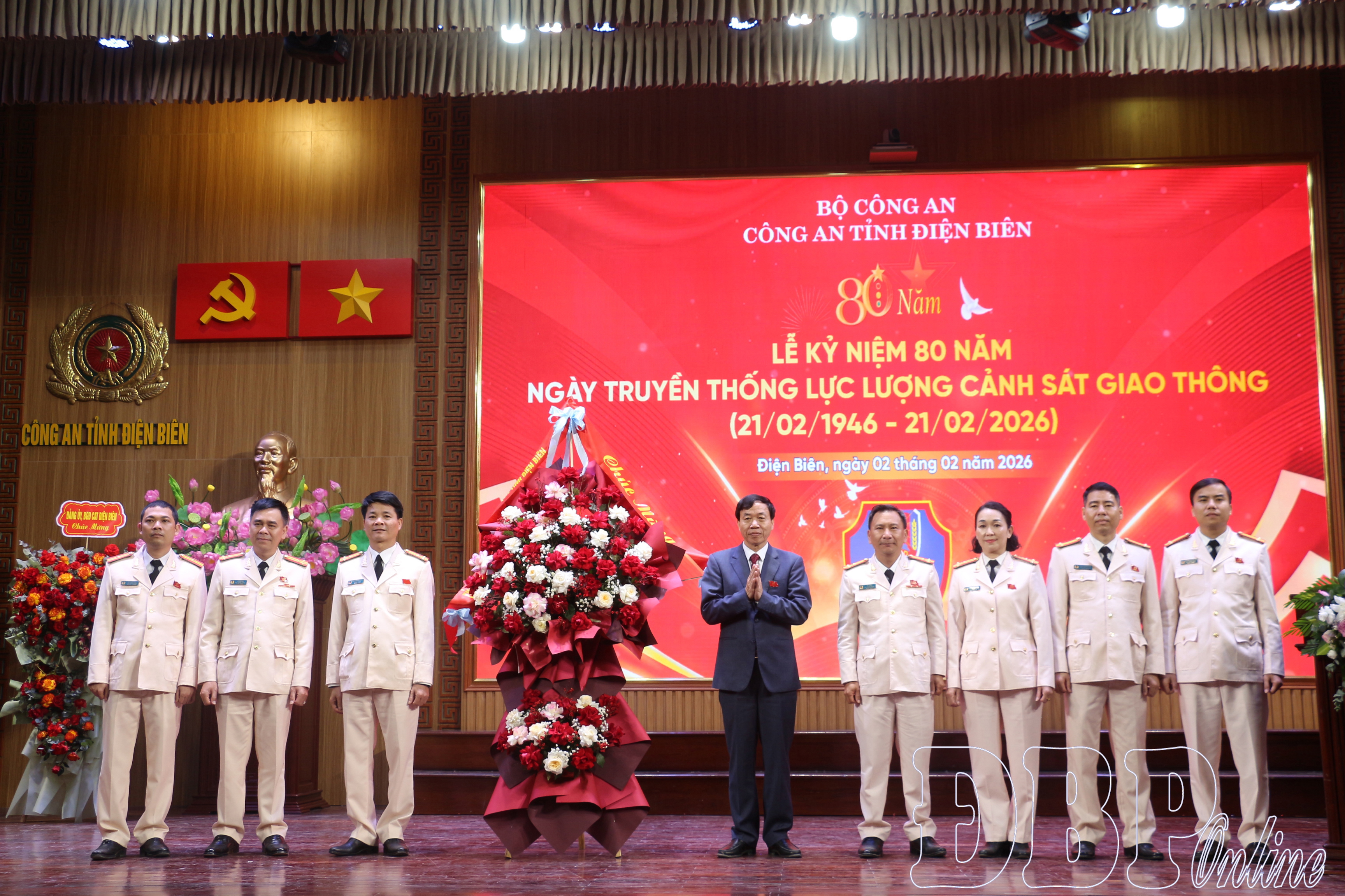 Đồng chí Lê Văn Lương, Phó Bí thư Tỉnh ủy, Chủ tịch UBND tỉnh, Trưởng ban An toàn giao thông (ATGT) tỉnh tặng hoa chúc mừng lực lượng CSGT tỉnh Điện Biên.