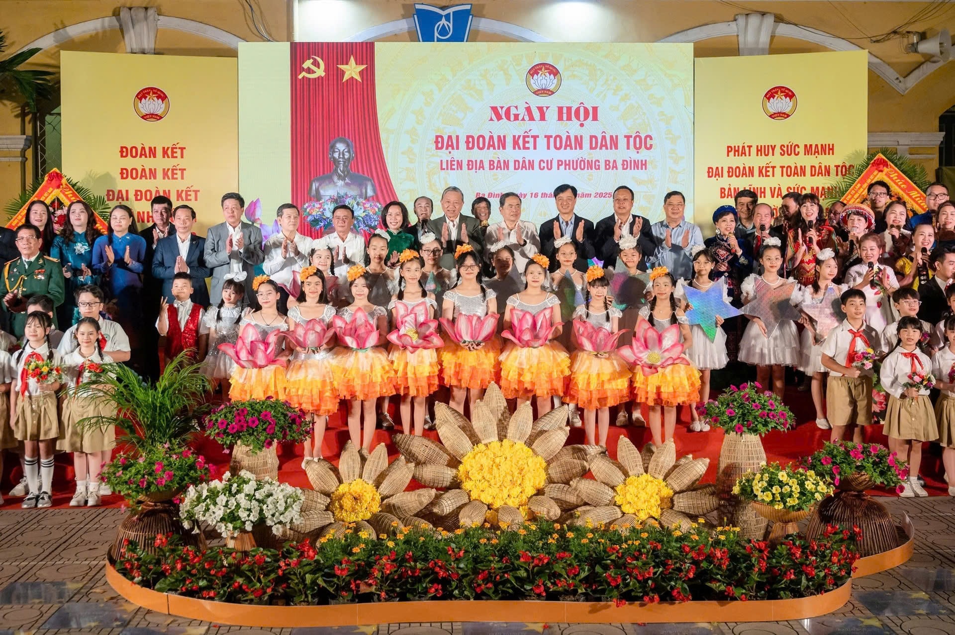 Các đồng chí lãnh đạo Đảng, Nhà nước, thành phố Hà Nội chung vui Ngày hội Đại đoàn kết toàn dân tộc với nhân dân liên địa bàn dân cư phường Ba Đình. Ảnh: PT