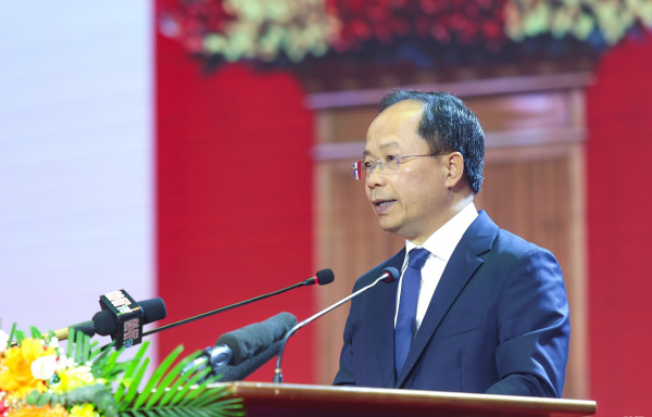 Đồng chí Nguyễn Duy Lâm, Bí thư Tỉnh ủy, Trưởng đoàn ĐBQH tỉnh Hà Tĩnh trình bày diễn văn tại buổi lễ.