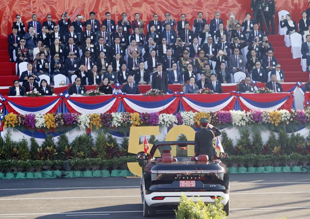 Ngay sau diễn văn của Tổng Bí thư, Chủ tịch nước Lào Thongloun Sisoulith, lễ diễu binh, diễu hành của các lực lượng vũ trang; các bộ, ban, ngành; các tổ chức, đoàn thể chính trị-xã hội diễn ra hoành tráng, trang nghiêm, thể hiện sinh động những thành tựu trên mọi lĩnh vực đời sống, xã hội, kinh tế và quốc phòng mà Đảng và nhân dân Lào đã giành được trong suốt 50 năm qua.