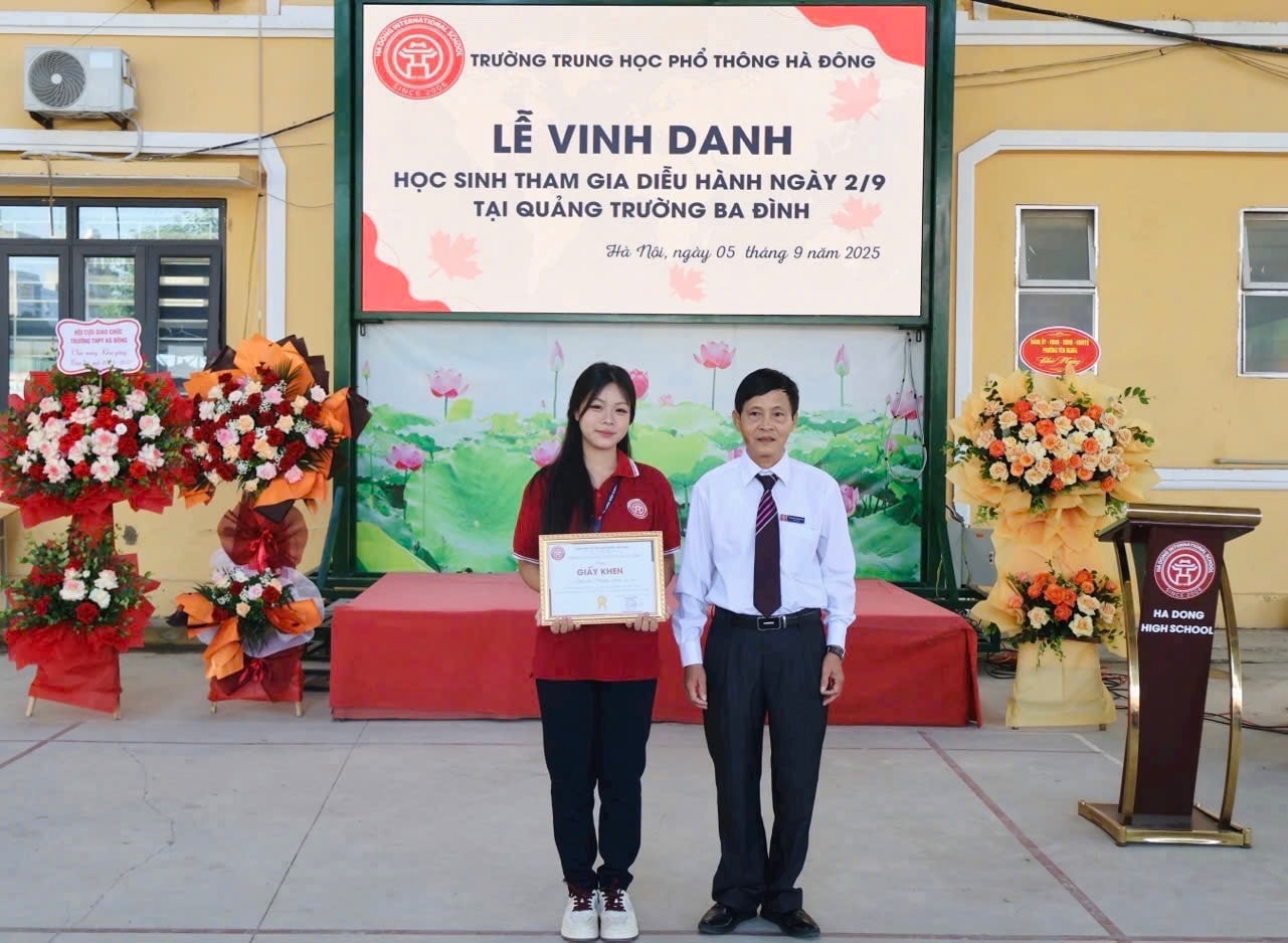 Nhà giáo Nguyễn Thế Quang, Hiệu trưởng Trường THPT Hà Đông vinh danh Nguyễn Phương Linh - học sinh tham gia diễu hành trong sự kiện A80. Ảnh: ND