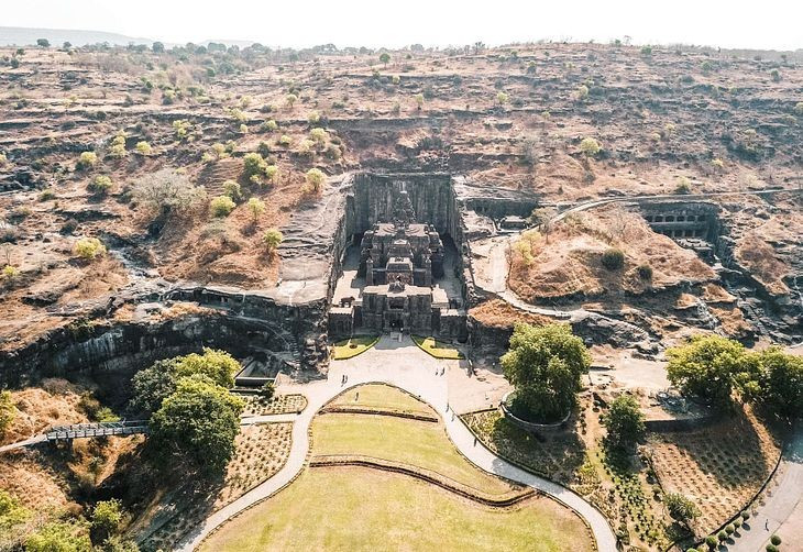 Đền Kailasa là kiệt tác nổi bật nhất. Được tạc từ một khối đá duy nhất, ngôi đền khổng lồ này được xem là công trình điêu khắc đá nguyên khối lớn nhất thế giới. Ảnh: Pinterest.