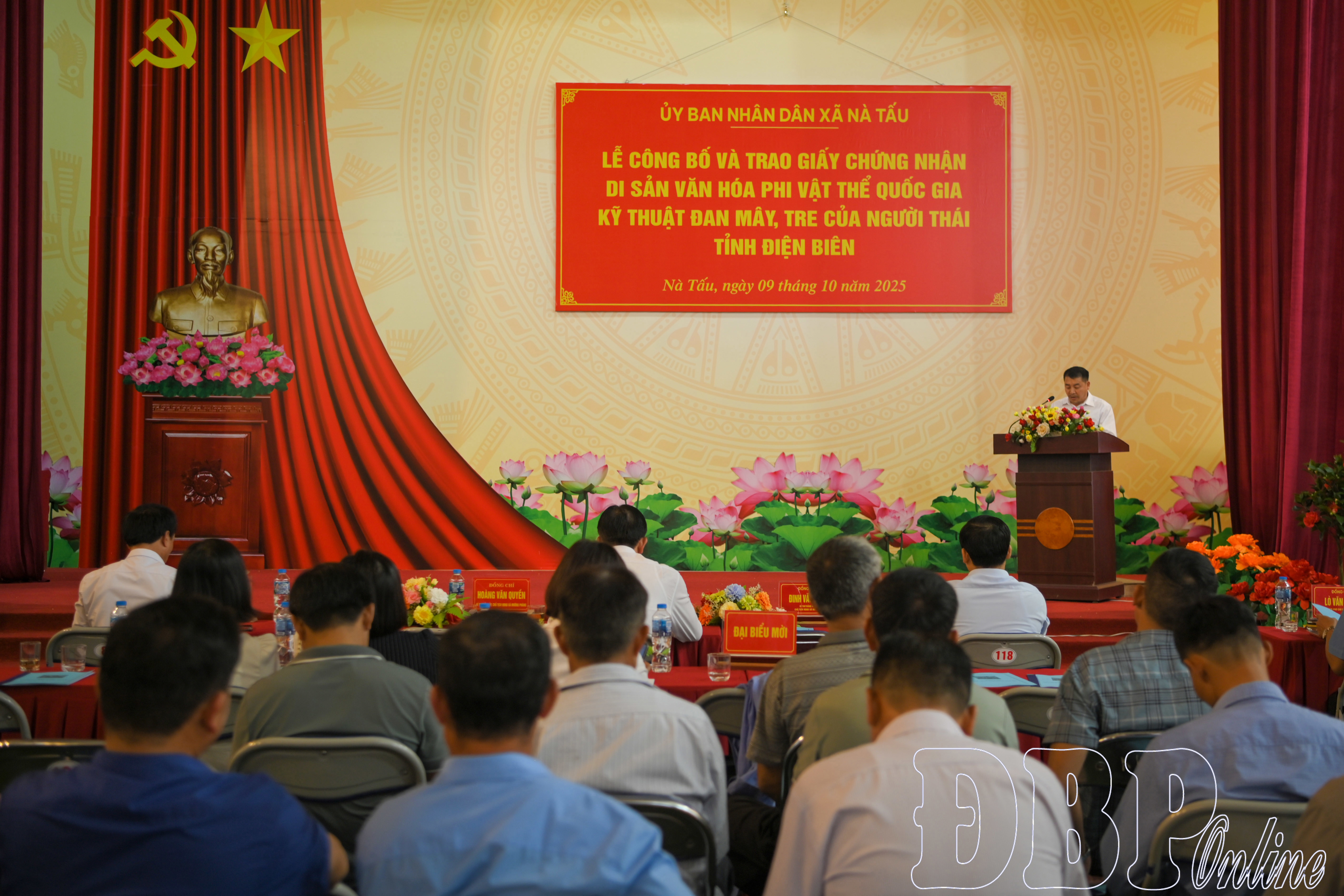 Tại buổi lễ, đại diện lãnh đạo Sở Văn hóa, Thể thao và Du lịch đã công bố Quyết định và trao giấy chứng nhận di sản văn hóa phi vật thể cho xã Nà Tấu và 30 xã, phường trên địa bàn tỉnh có chủ thể nắm giữ, thực hành di sản kỹ thuật đan mây, tre của người Thái.