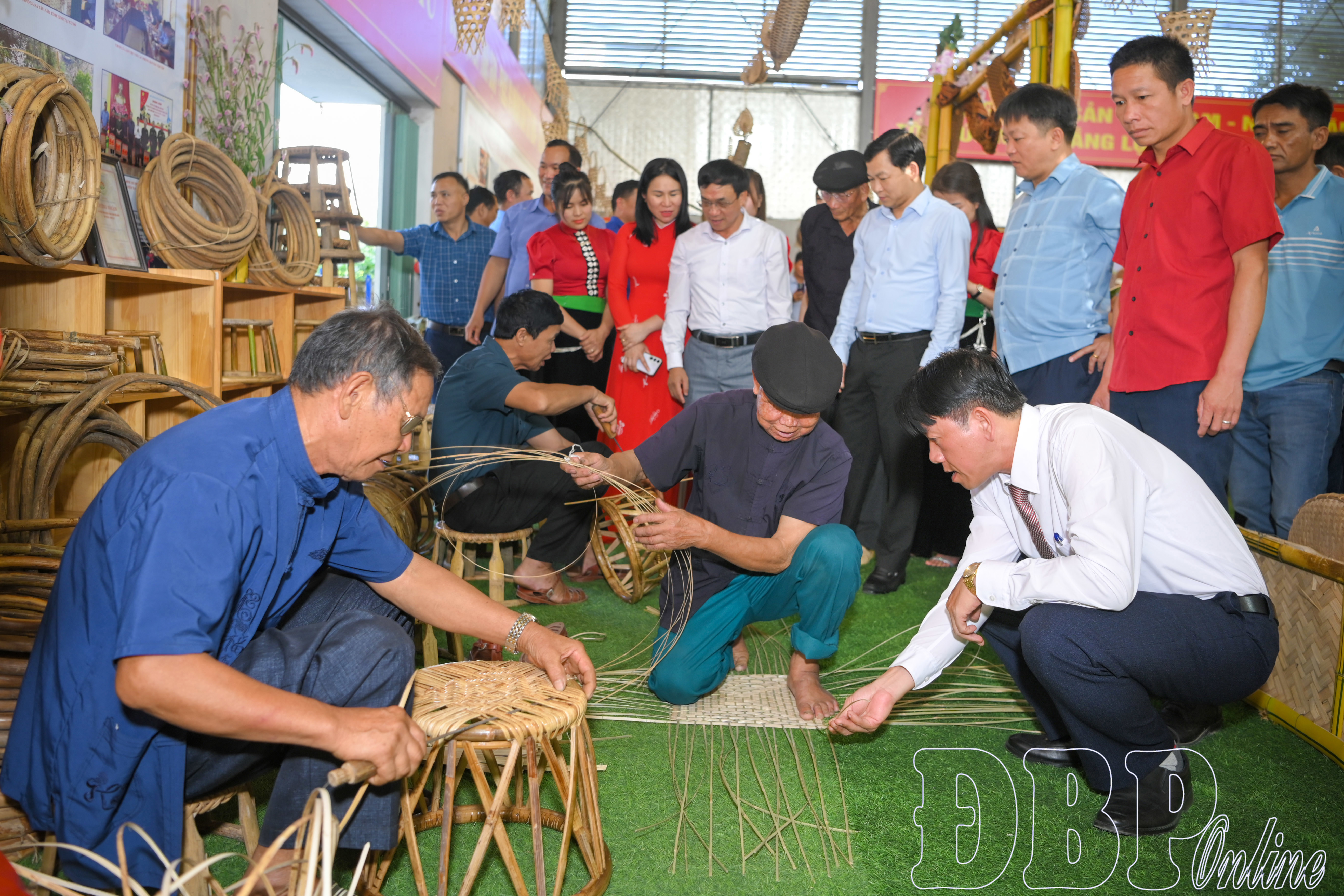 Đại biểu tham quan các sản phẩm của Hợp tác xã Làng nghề mây tre đan truyền thống bản Nà Tấu 1.
