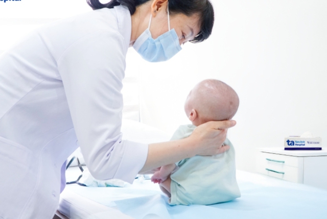 Bác sĩ kiểm tra chức năng vận động cho bé. Ảnh: BVCC