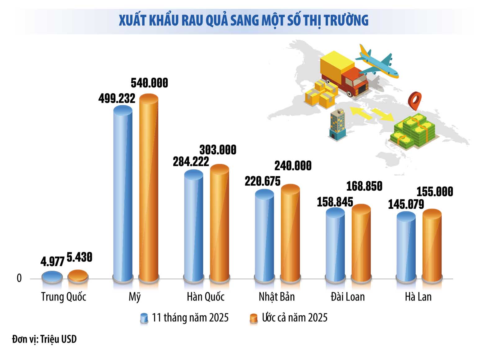 Xuất khẩu hàng rau quả sang Trung Quốc 11 tháng đạt xấp xỉ 5 tỷ USD, tăng khoảng 15% so với cùng kỳ năm trước và đã vượt kỷ lục 4,63 tỷ USD của cả năm 2024. Tương tự, xuất khẩu sang thị trường Mỹ đạt 499,2 triệu USD, tăng 56%, xuất khẩu hàng rau quả sang thị trường Hàn Quốc đạt 284,2 triệu USD.